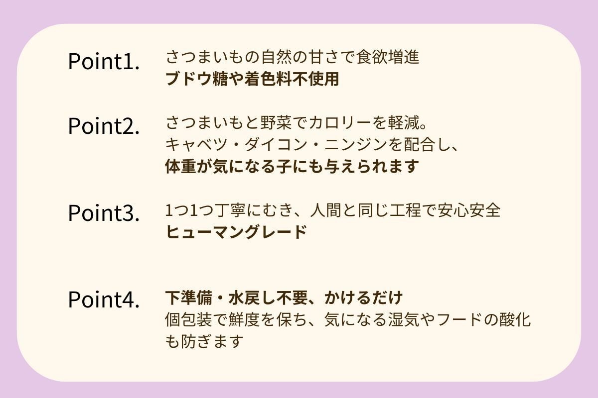 食物繊維が多いさつまいもは、健康維持をサポートし栄養補助として役立ちます。さつまいもの皮には、尿路結石の原因とされる硝酸も多く含まれるため、手作業で丁寧にむきました。また、カロリーが気になるさつまいもですが、他の野菜と摂取することで気にせず与えられます。