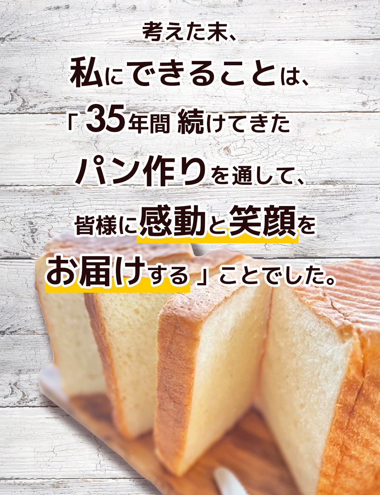これまで培ってきたパン作り35年の技術と経験を存分に活かし、どこか懐かしい、飽きの来ない美味しさの詰まったパンを作り、被災地にて販売致します。