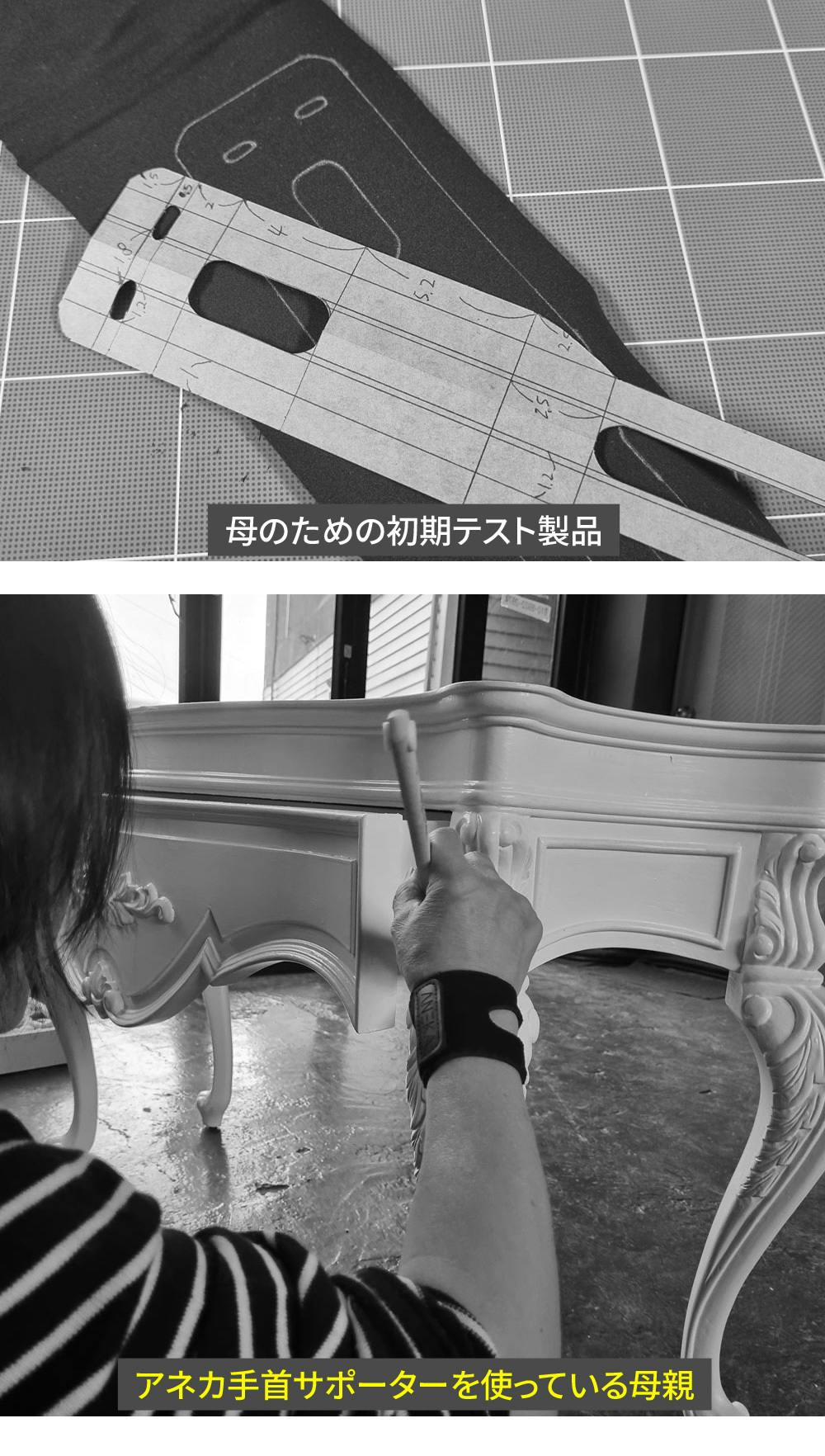 母親は繰り返しの作業で手首に負担を感じており、従来使っていたプロテクターの着用に不便を感じているのを見て、カバン製作で培ったイタリアのパターン開発技法を手首サポーターの開発に適用しました。