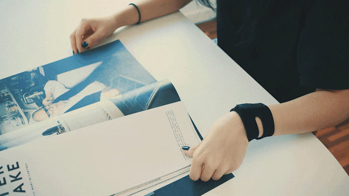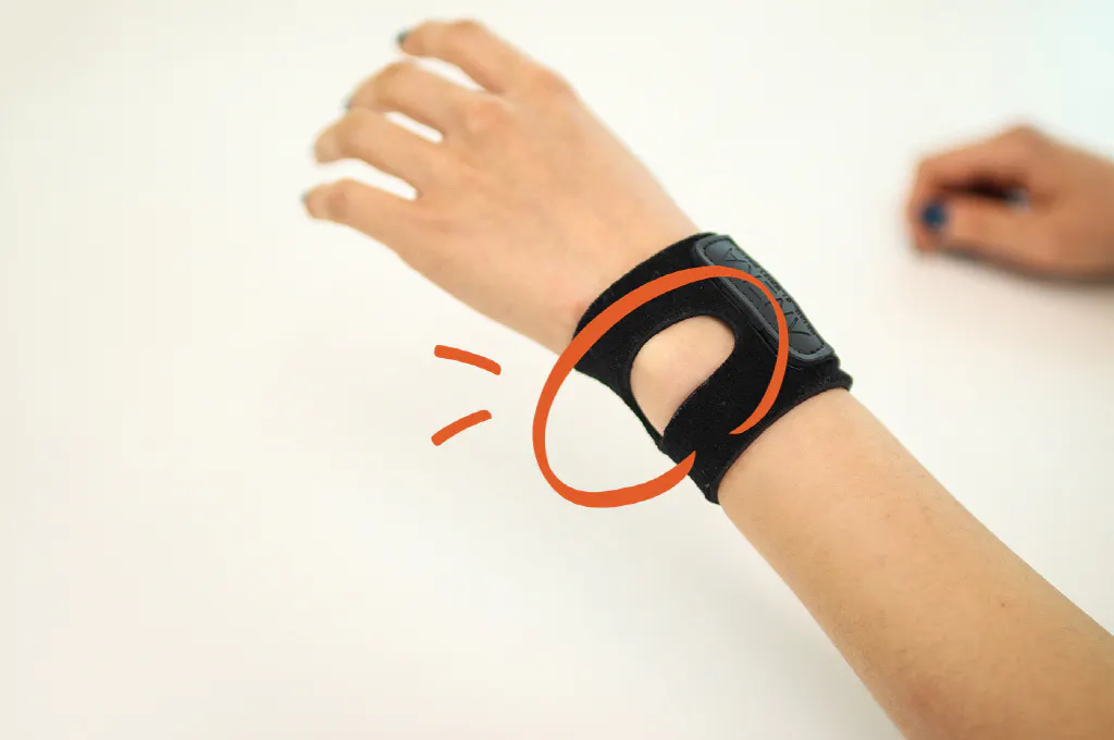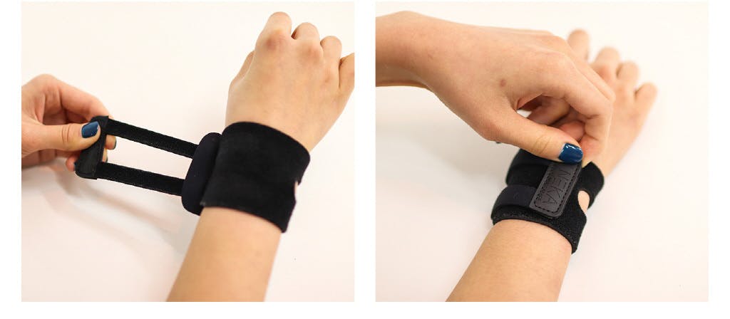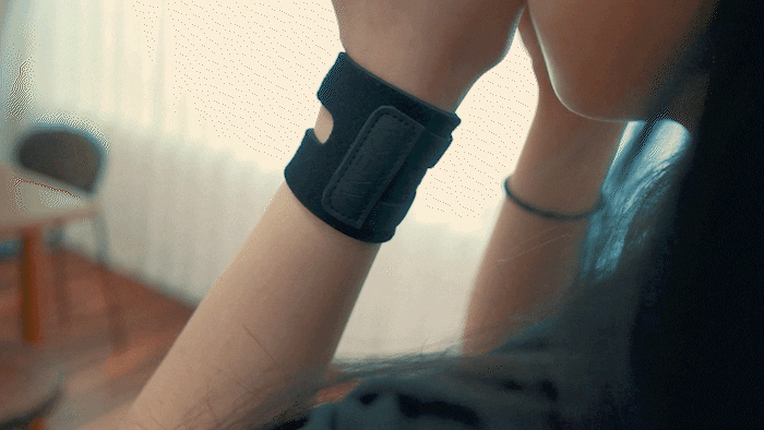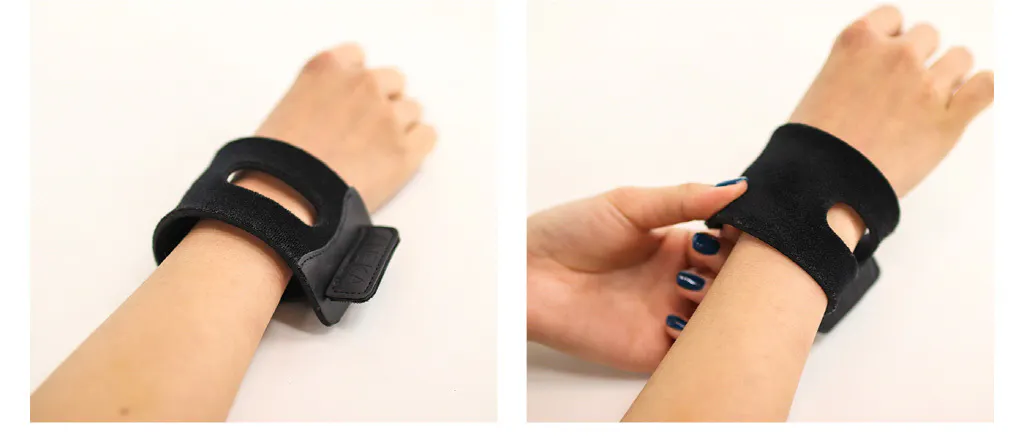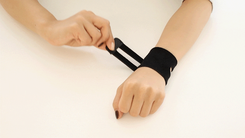 粘着テープがはがれにくいように、薄いラベルを採用し、丸い形を保つパターンを採用しました。手首に簡単に装着し、圧迫強度を調節しながら粘着テープを引っ張って貼り付けることで、着用が完了します。