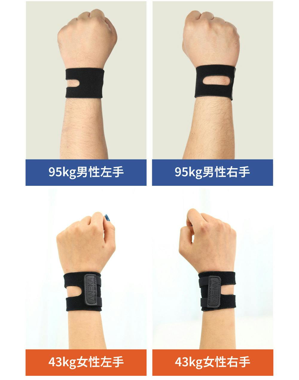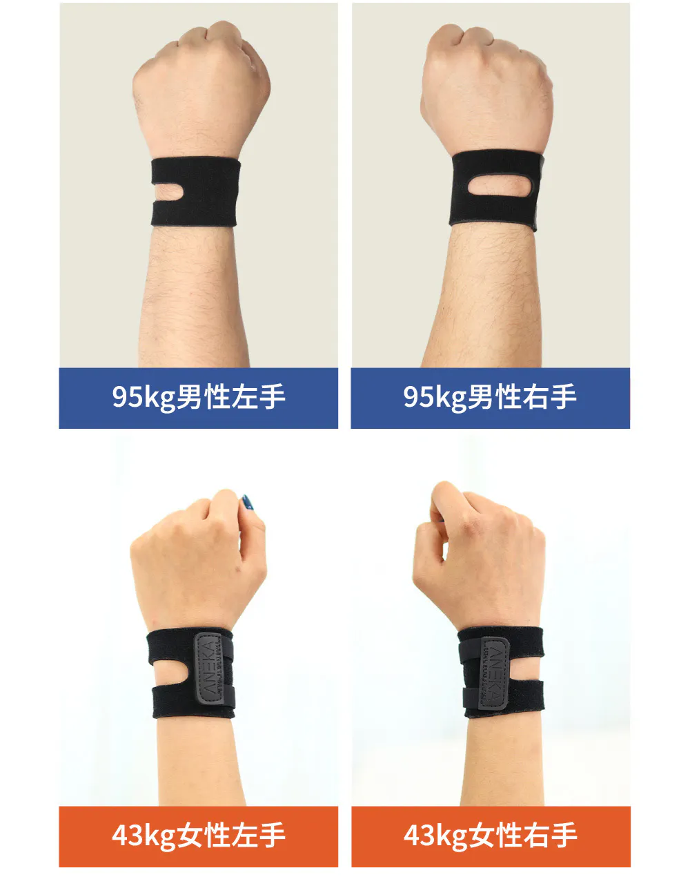 着用事例として95kgの手首が厚い男性から手首が薄い43kgの女性まで全て着用が可能で、右手、左手の区別なく両手とも着用できます。