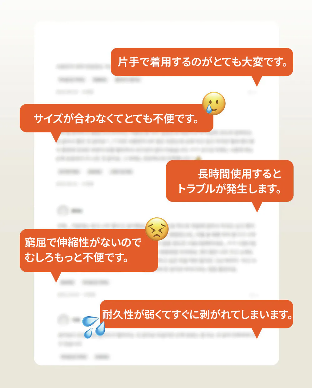 工芸製品をハンドメイドで作業をする母の仕事を手伝っている途中手首の不便さを感じる姿を見てインターネットで手首サポーターを購入してプレゼントしたが, 動作によって不便さがもっと加重される姿を見て母のための手首サポーター開発を始めて, 母から多様なフィードバックを受けてサンプルたちを作り始めました。