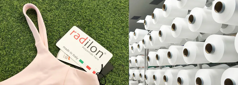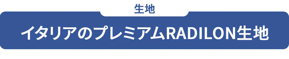 Radilon生地はイタリアカンパニーのRADICHI社が生産するプレミアムナイロン原糸で、微細なフィラメントで作られるRadilonは肌接触に優れた快適さを提供します。