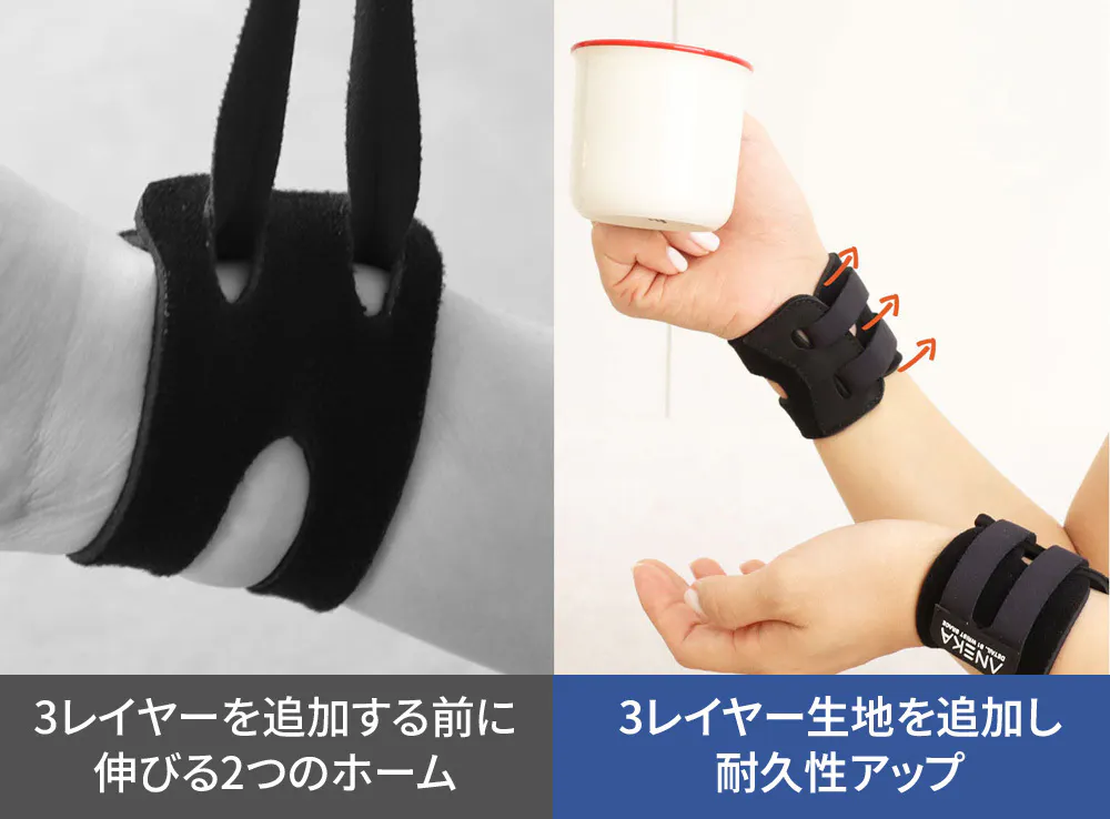 毎日の着脱が面倒…そんなお悩みを解決する手首サポーター。 伸縮性のある生地を使用して強く引っ張るようになったときに2つのレイヤーが伸びるのを防ぐため、ゴム素材を加えて耐久性をさらに高めました。