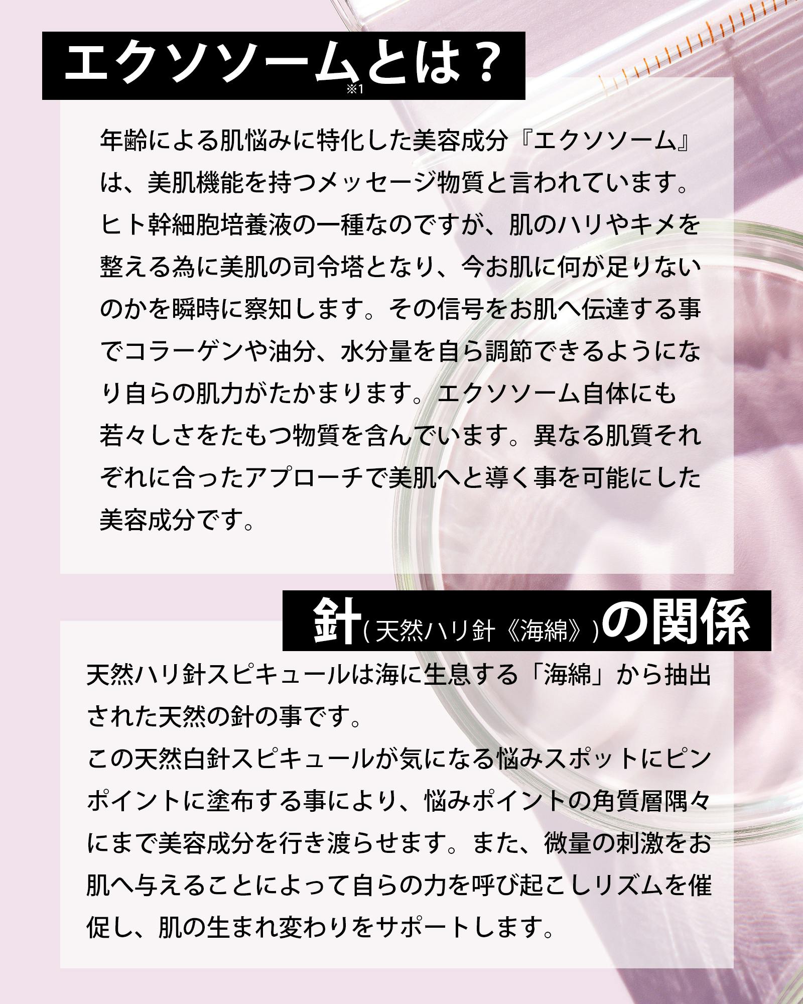 美肌機能を持つメッセージ物質と言われています。ヒト幹細胞培養液の一種なのですが、肌のハリやキメを整える為に美肌の司令塔となり、今お肌に何が足りないのかを瞬時に察知します。その信号をお肌へ伝達する事でコラーゲンや油分、水分量を自ら調節できるようになり自らの肌力がたかまります。エクソソーム自体にも若々しさをたもつ物質を含んでいます。異なる肌質それぞれに合ったアプローチで美肌へと導く事を可能にした美容成分です。