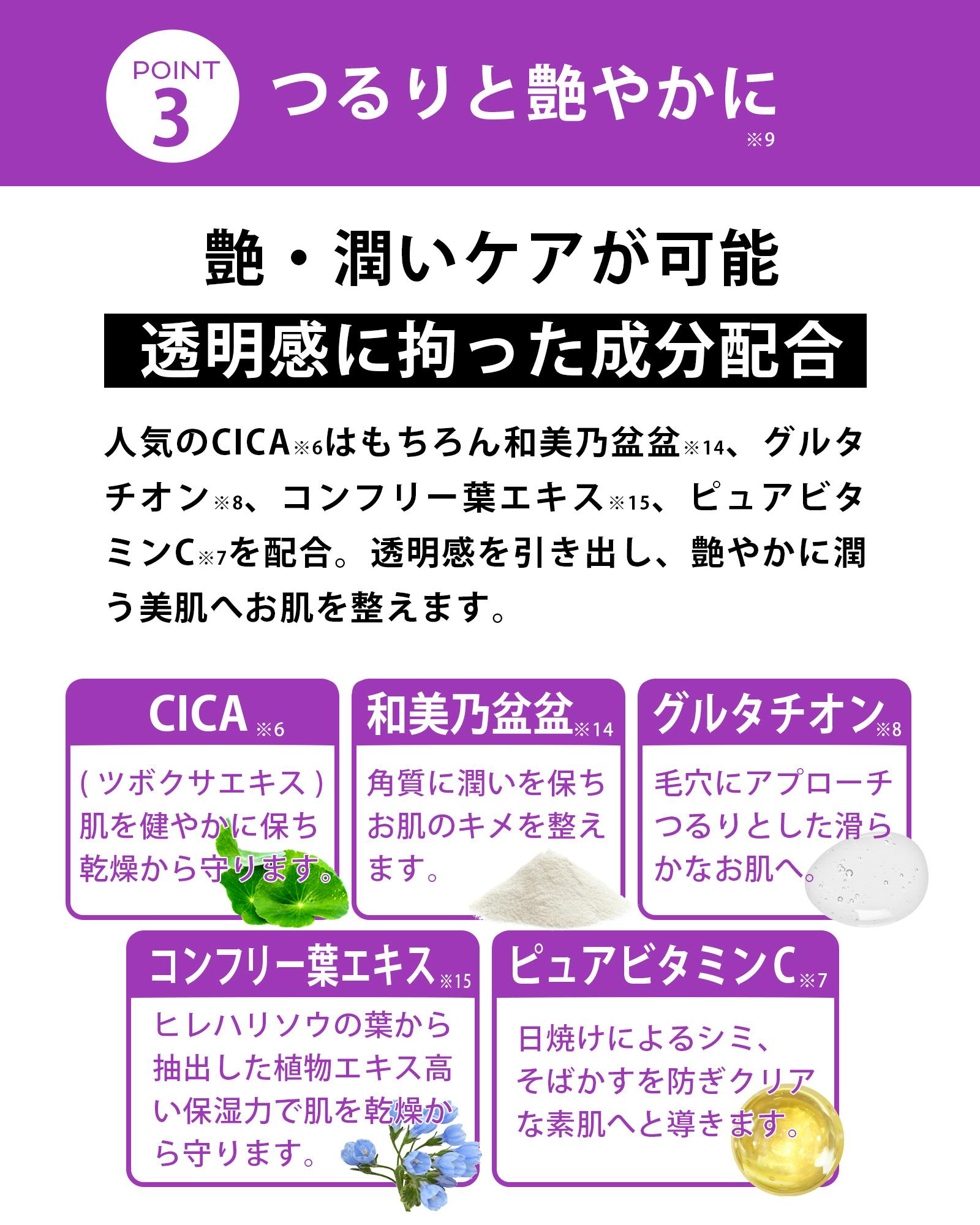 さらに天然白針スピキュール※2も優れた美容成分となり、肌リズムを整えます。 気になるシミやそばかす※7、ニキビ跡※11にご使用ください。