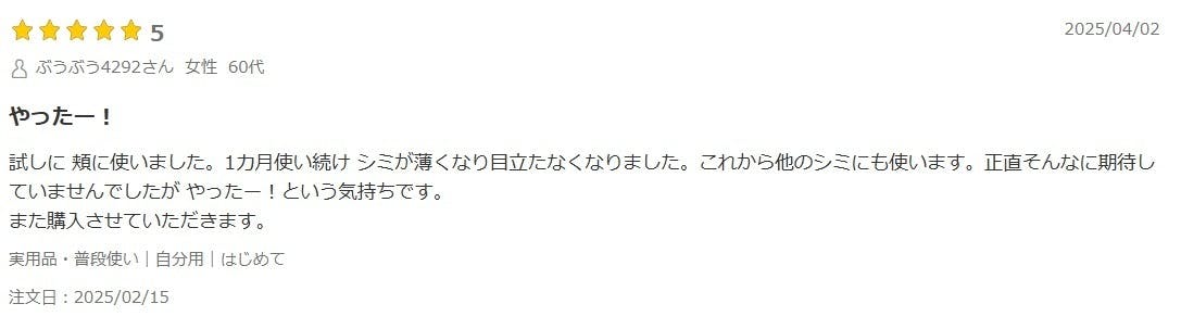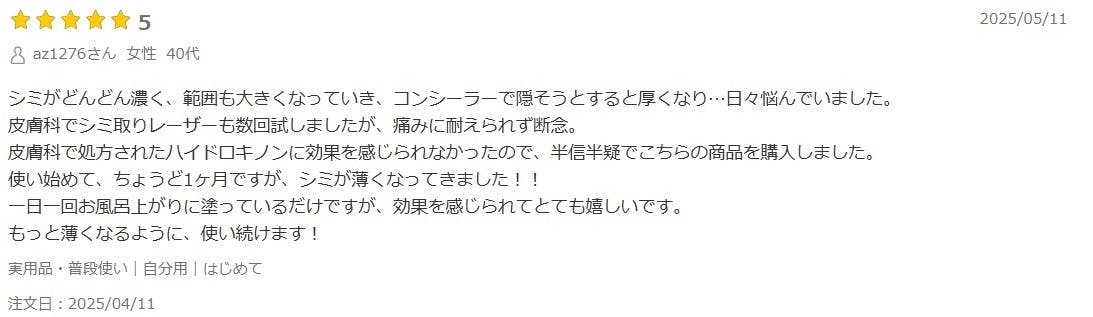 2025/06/16 12:08こんにちは!商品開発担当の神崎です。先週末に皮膚科に行きまして、数年前から消えずに残っている「虫刺され跡」の相談をしました。頑固な黒ずみになっている状態で、結構目立つので気になっていました。先生に相談すると、ハイドロキノンを塗るのがオススメとのことで教えていただきまして、頑固な黒ずみや虫刺され跡にもハイドロキノンが良いと改めて実感しました。先生に”マークエイド ハイドスピキュールクリーム”を見ていただきまして、塗布してよいか確認しましたところ、「ハイドロキノンの配合量も5%で丁度いいですね、こちらで問題なし!」と使用の許可をいただきました。毎日、頑固な黒ずみになった虫刺され跡にマークエイド ハイドスピキュールクリームを塗っています。結果が楽しみです♪引き続きマークエイドプロジェクトを宜しくお願いいたします!! もっと見る「マークエイド エクソスピキュールクリーム」お客様レビューをご紹介♪