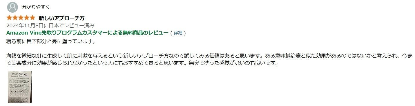 2025/06/13 09:50本日は「マークエイド エクソスピキュールクリーム」をお使いいただいています、お客様のレビューをご紹介します!【お客様レビュー】これすごいです。塗って寝ると、塗ったところが翌朝ツルツル!アラフォーのたるみ毛穴が、1回で明らかに目立たなくなります。嬉しくて毎日ついついいっぱい塗ってしまうのですぐになくなりそう。でもお高い美容液に比べたら1カ月に4本使ってもコスパ良いです!針は短く切り揃えられてるようで、痛くないです。塗り込むと少しピリピリするかな?くらいで、敏感肌でも大丈夫でした。~~開発担当より~~ご実感いただけたようで大変嬉しく思っています!まず始めに実感いただけるのが「肌のツルツル感」。この体感は多くの方がすぐに実感いただけるポイントです。スピキュール(0.2㎜サイズの微細な天然美容針)が美容成分の浸透を助け、ごわついたお肌でもスムーズにエクソソームはじめリッチな成分がしっかり角層へいきわたります。そのため、ピンとハリのある滑らかなツルっとした肌感触が生まれます。ツルツルした肌は、光の反射がきれいに跳ね返り「ツヤ感」となります。また、こちらのクリームは天然美容針のスピキュールが1本に約6万本以上配合しています。数字に驚かれる方もいらっしゃいますが、痛みはありません。「心地よい微刺激」と感じる方がほとんどだと思います。お肌に弾力がなくなると「たるみ毛穴」が気になりますよね。。スピキュールはお肌に活力を与え、プリっとした上向きハリ肌へ導きます!さらに「自らの肌力を向上させてくれる」とても素敵な美容成分です。是非ご使用いただき、ご実感いただけますと幸いです。引き続き、マークエイドプロジェクトを宜しくお願いいたします! もっと見る
