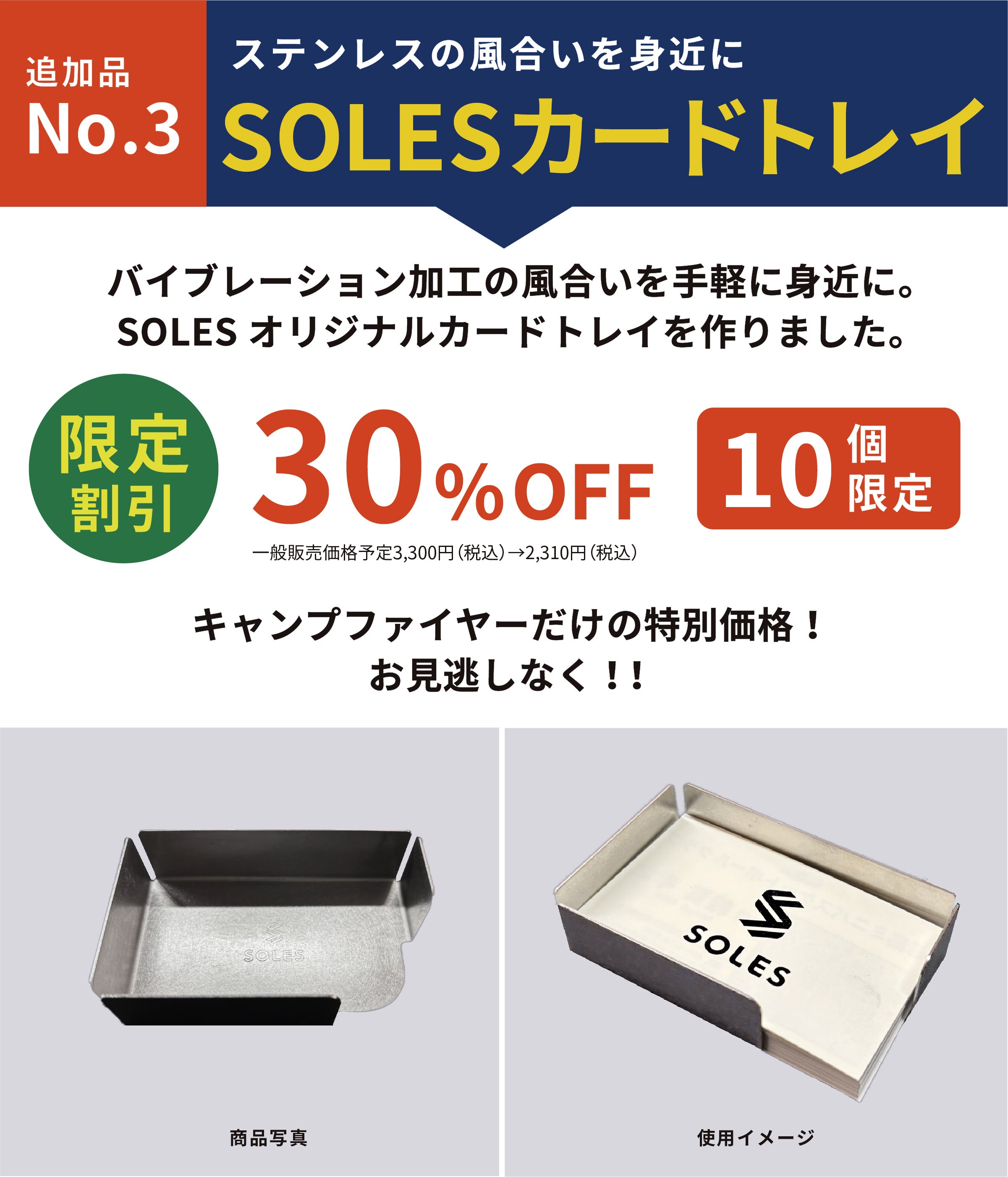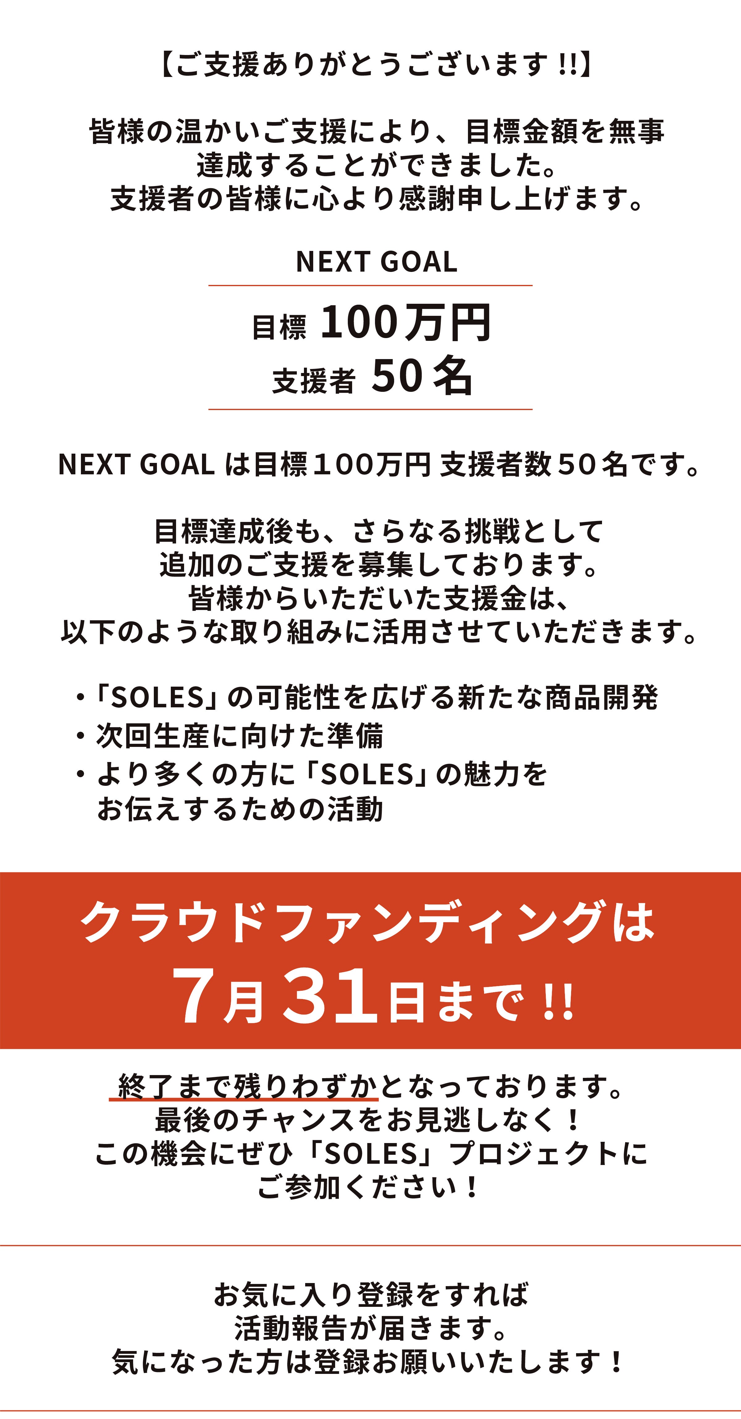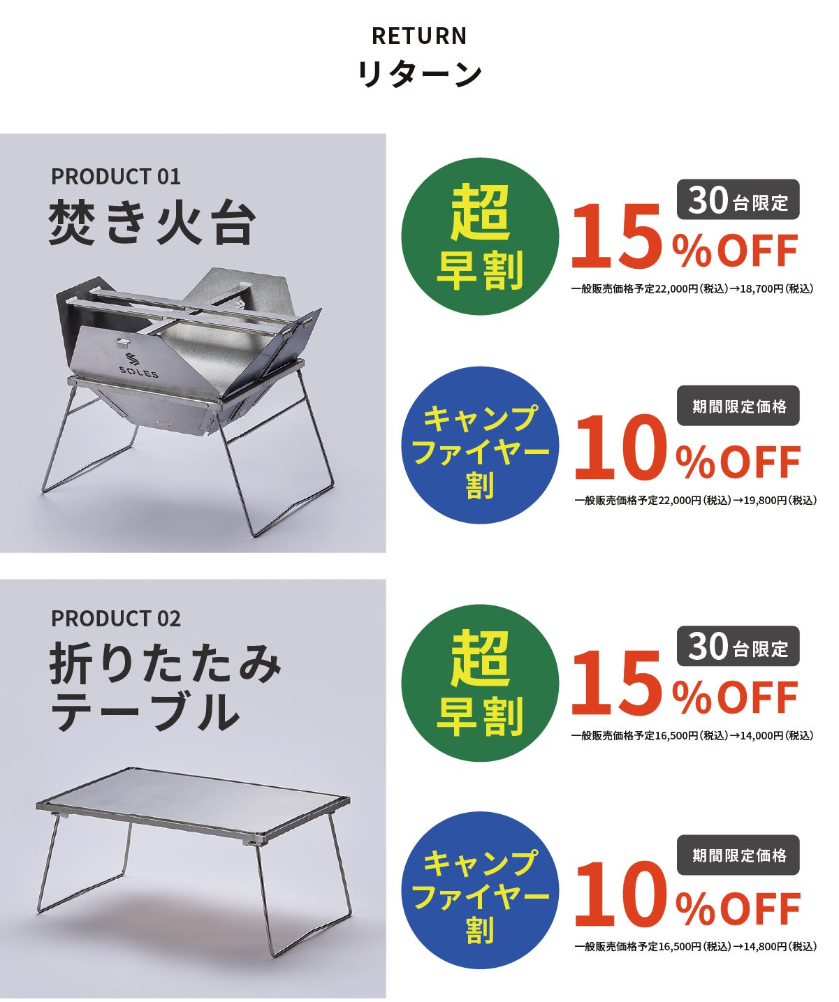 2025/09/17 17:26こんにちは。本プロジェクトにご支援いただきまして誠にありがとうございました。ご支援いただきましたみなさま、たいへんお待たせ致しました!丁寧に梱包し、発送の準備を行っております。順次発送させていただきますので、到着まで今しばらくお待ちください。今後も新たな商品を開発していきます。引き続きご愛顧いただきますよう宜しくお願い致します。SOLES 公式ホームページ https://soles.jpSOLES 公式Instagramhttps://www.instagram.com/soles_camp/ もっと見る