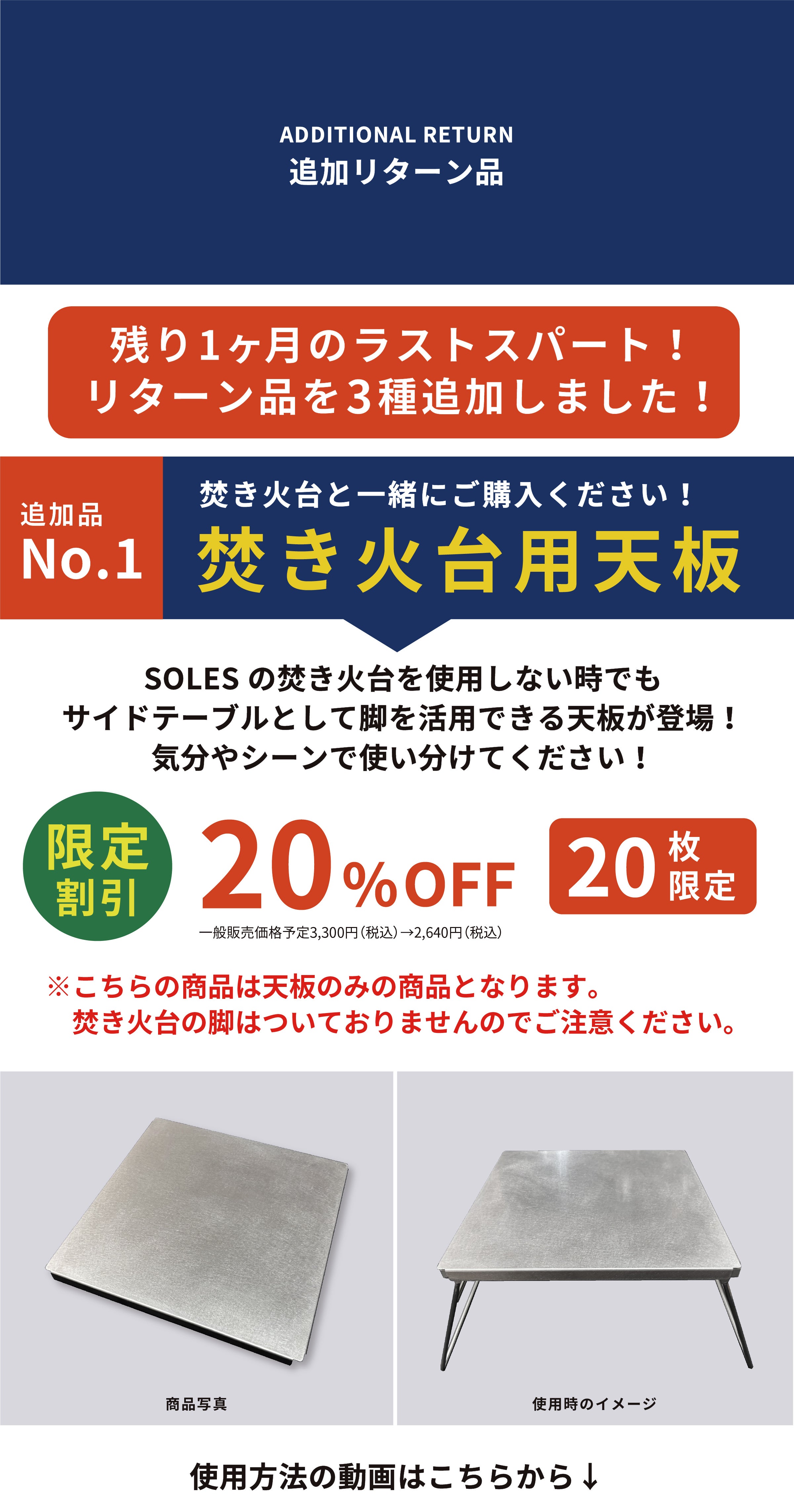 2025/07/28 15:48こんにちは。プロジェクト終了まで、いよいよ残り3日となりました。ご支援、応援、本当にありがとうございます。ラストまでしっかり届けてまいります!この焚き火台の魅力は、「組立簡単、5秒で組立ができる」ことです。パカッと開いて乗せるだけ。設営をすぐに終わらせて余った時間をゆっくりくつろぐ時間に費やすことができます。後片付けもスムーズ、とてもコンパクトになるので専用収納バッグに入れて持ち運びが簡単です。また、部品の全てに至るまでステンレス(SUS304)を採用しているので耐久性に優れ、水洗いしてもサビることはありません。和歌山の町工場が挑む、”一生モノ”のアウトドアギアを宜しくお願い致します。 もっと見る