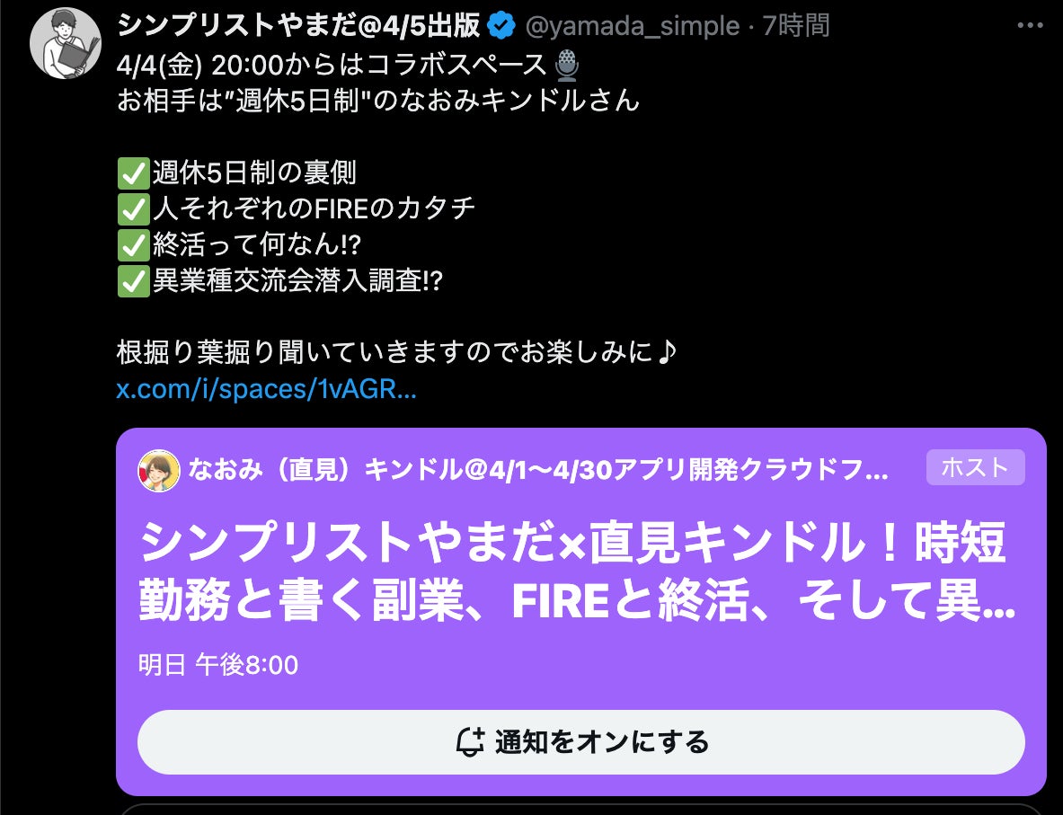 4/4(金)の20時からシンプリストやまださんとXスペースコラボ配信をさせていただきました!