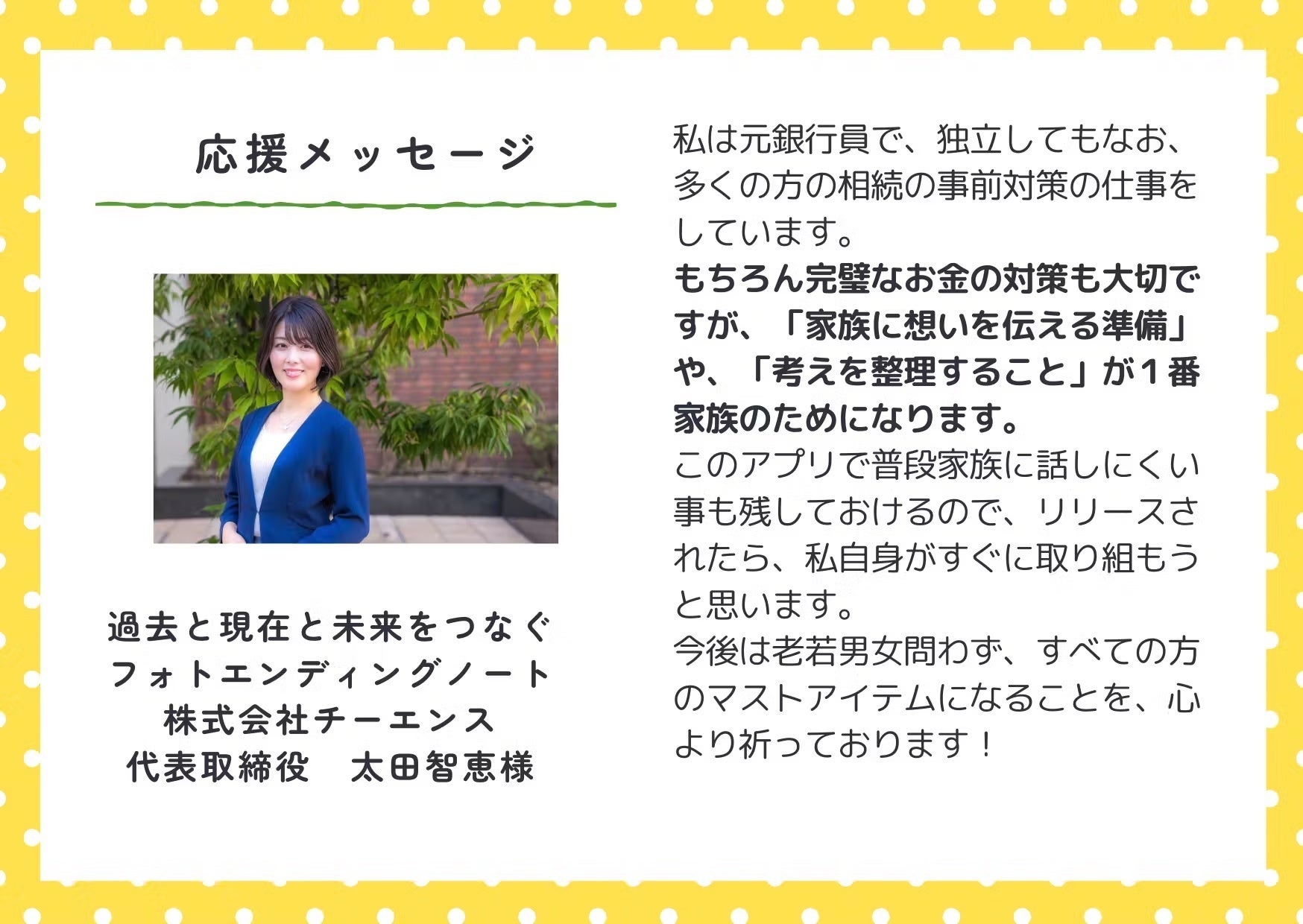 終活アプリの「プレミアムスポンサー」のご支援をいただいた、株式会社チーエンスの代表取締役 太田智恵様から応援メッセージをいただきました!