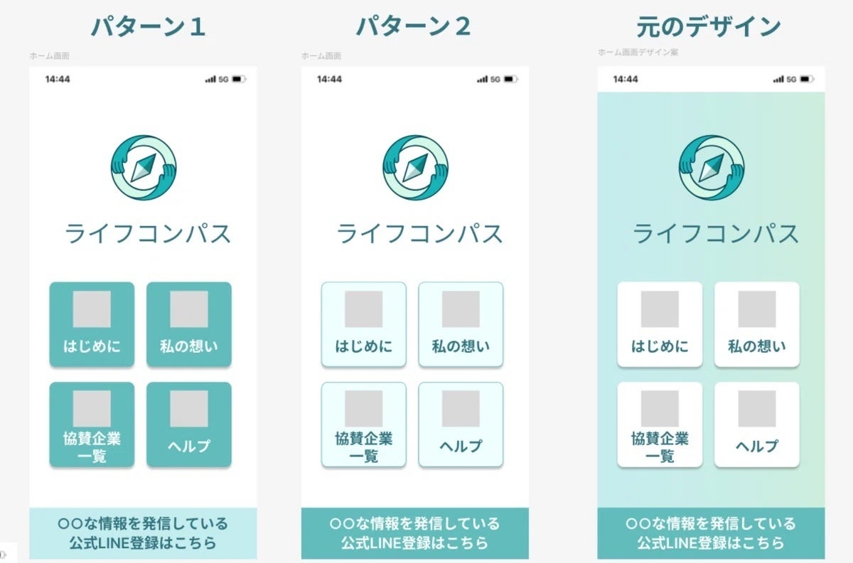 まだ途中段階ですが、アプリデザインは様々なパターンを出していただいて相談したりもします!!