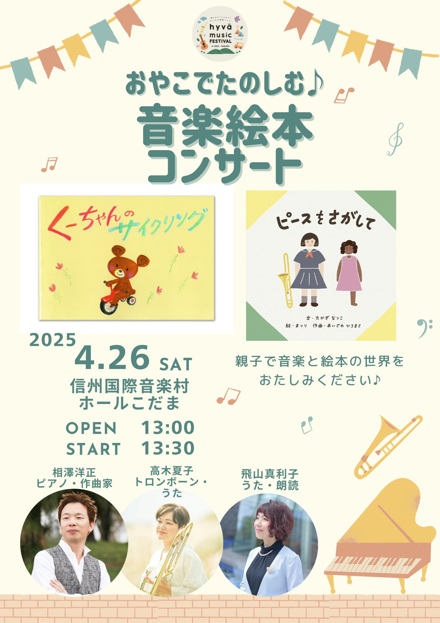 音楽絵本「ピースをさがして」や音楽絵本推進協会作の音楽絵本「くーちゃんのサイクリング」を中心に親子で音楽、絵本、朗読の世界をたっぷり楽しめる内容でお届けします。