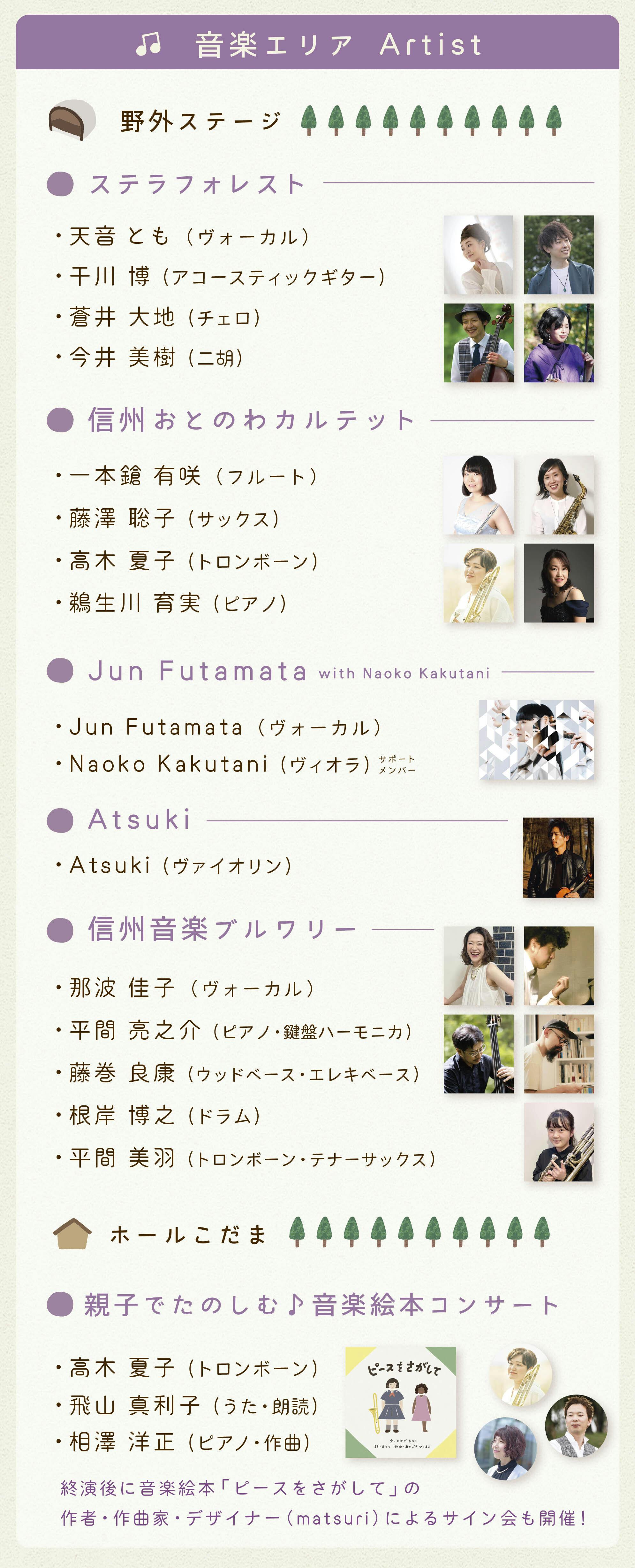 野外ステージでの生演奏信州ゆかりのプロ奏者による演奏でフェスティバルを盛り上げます!