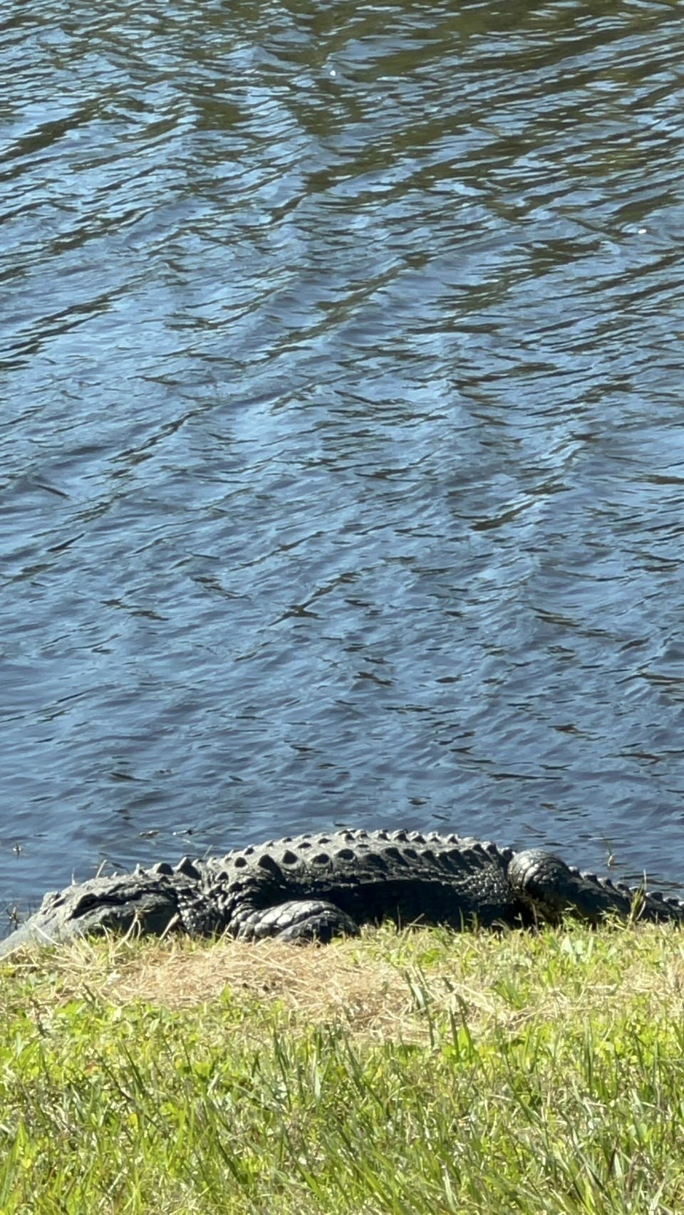 ・ワニとの遭遇!NASAの広大な敷地は、野生動物の楽園でもあります。湖のほとりで、悠然と横たわる巨大なワニを発見!