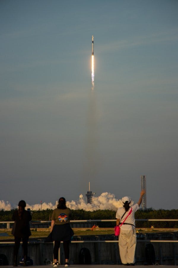 SpaceXのFalcon 9ロケットがエンジンを点火し、轟音と共に空へ舞い上がる瞬間は、まさに圧巻でした。NASA Socialの公式ビューポイントからの視界は最高で、クルーを乗せたドラゴン宇宙船が夜明けの空を突き抜けていく様子を、息を呑んで見守りました。