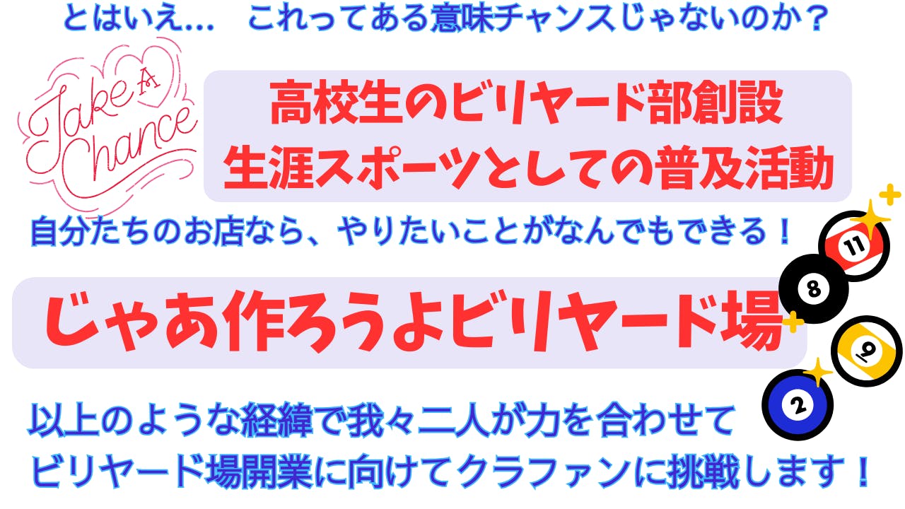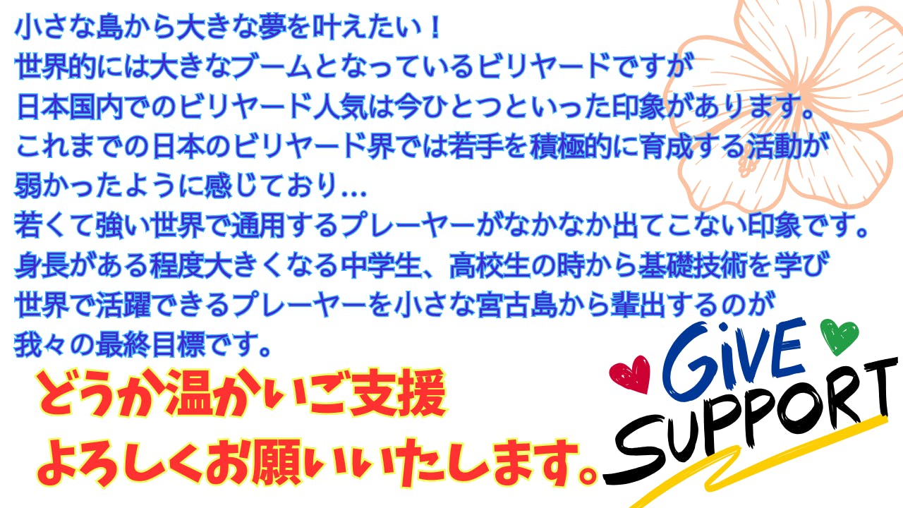 2025/03/20 21:17当記事をご覧いただき誠にありがとうございます。私どもYAZAWA、KAZUYAの両名は、沖縄の離島 宮古島から消えてしまったビリヤード場を復活させるべく「宮古島にビリヤード場を作る!」プロジェクトを立ち上げました。宮古島のビリヤード文化は本土や沖縄本島とはまた少し違い、地元の高校生が常日頃からビリヤード場に通うほど地域に根付いておりました。しかしたったひとつだったビリヤード場が島から姿を消し、プールバーが数件あるものの、次世代を担う彼らのような若い層が練習する場所と機会は完全になくなってしまったのです。ビリヤードを深く愛し長年経験を積んできた我々は「このままではいかん!」と今後の宮古島のビリヤードを絶滅させないべく立ち上がり、今回の開業案に踏み出しました。YAZAWA、KAZUYA両者ともSNSの発信力は抜群にあり、どちらも過去に企業様とお仕事をさせていただいているほどのPR力があります。そんな私達の動画編集や企画のスキルを活かし、今後の活動としてYouTubeをはじめとしたSNS活動を積極的に行ってまいります。ご支援を検討いただいております企業様におかれましては、今後のPR活動の選択肢として是非私共へのご支援をお願いしたく存じます。個人の方におかれましては、まずはご自身のご予算やリターンの内容から総合的にご判断いただき、お気持ちと共にご支援いただきますようお願い申し上げます。以上、まずは本日より開始されました当プロジェクト開始のご挨拶とさせていただきまして、皆様の厚いご支援をお願いしたく存じます。よろしくお願い致します。プロジェクト代表 YAZAWA & KAZUYA もっと見る