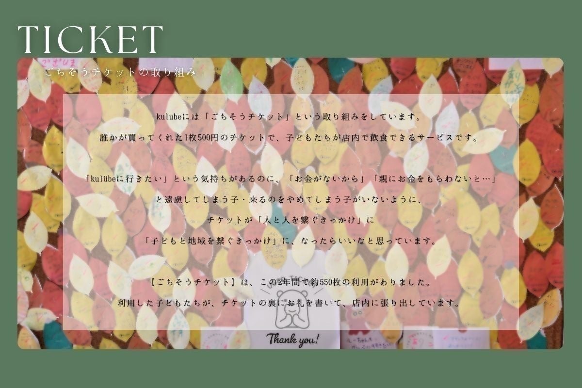→支援金の半額分をごちそうチケット。店内に掲示し、お腹の空いた子どものために - ・カフェメニューの拡充に貢献