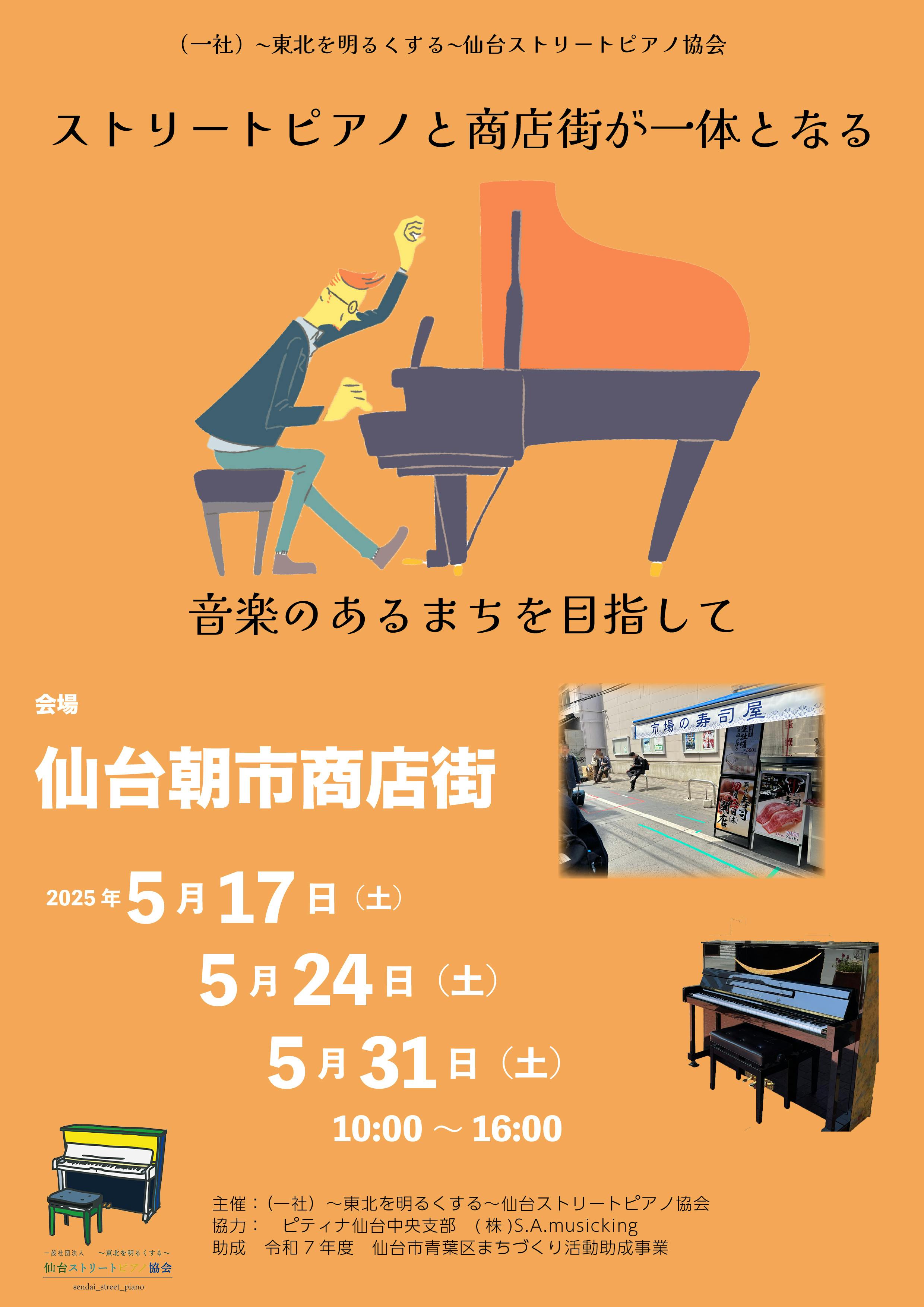 2025/06/05 21:41ストリートピアノと商店街が一体となる~音楽のあるまちを目指して~(5月17日、24日、31日仙台朝市商店)実施しました!残念ながら5月17日と31日は雨天のため中止となり、24日のみの開催でしたが、仙台朝市にピアノの音色が響きわたりいつもと違った「まちの表情」を見ることができました。 もっと見るゴールデンウイークストリートピアノプロジェクトを実施しました。