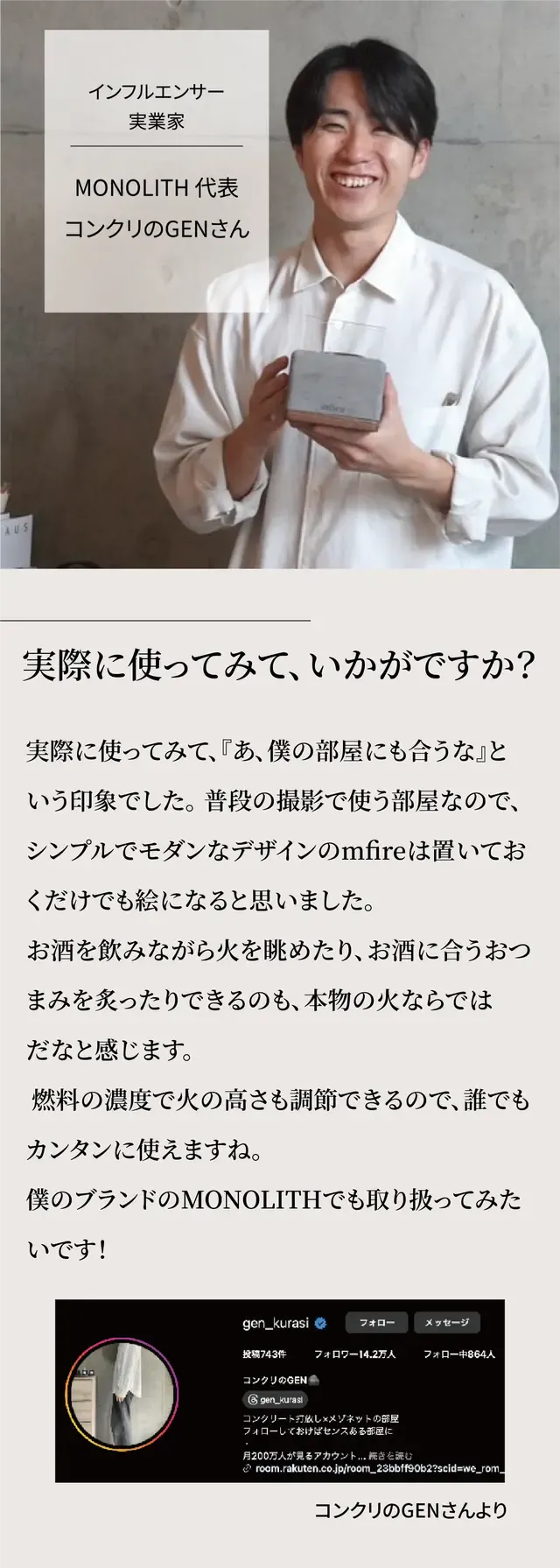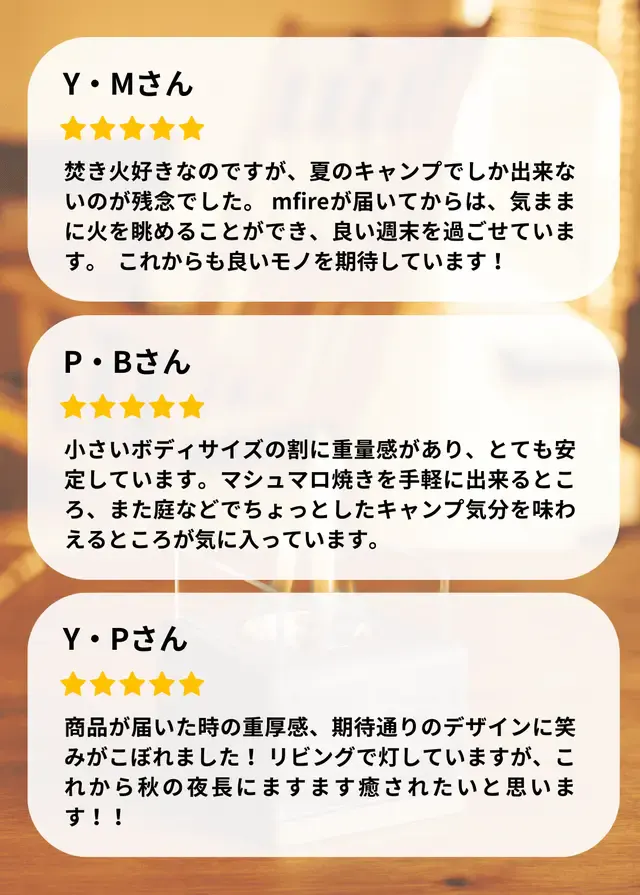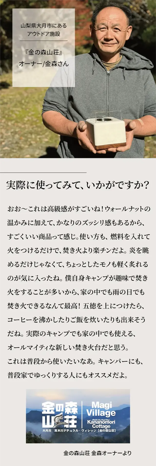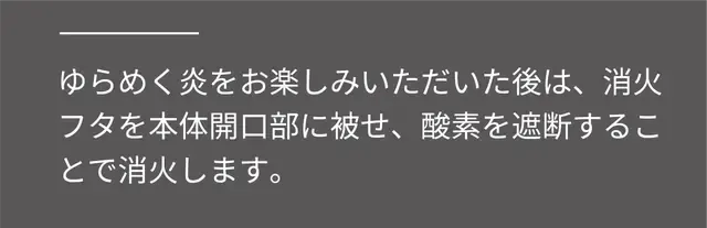 炎を眺めて一人の時間を楽しんだり、家族や友人との特別な雰囲気を満喫したりより多くの方に、心落ち着くひとときをお届けできれば幸いです。