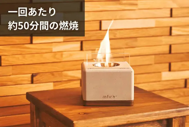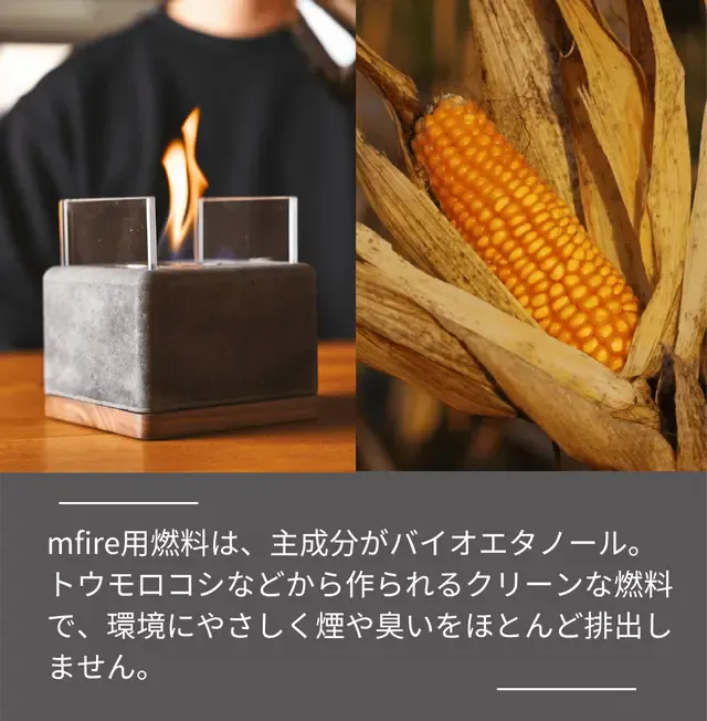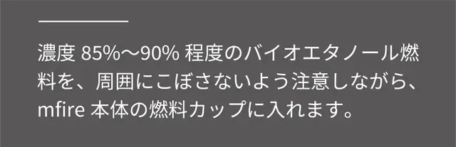 A.mfire専用燃料をお使いいただくことができます。また、専用燃料の他に市販されているバイオエタノール燃料(濃度85%以上のもの)も、お使いいただくことができます。mfire専用燃料はmfire公式オンラインサイトでも後日販売予定ですので、必要な際にお買い求めいただけます。灯油や軽油、ガソリンなどその他の燃料で代用することは絶対におやめください。