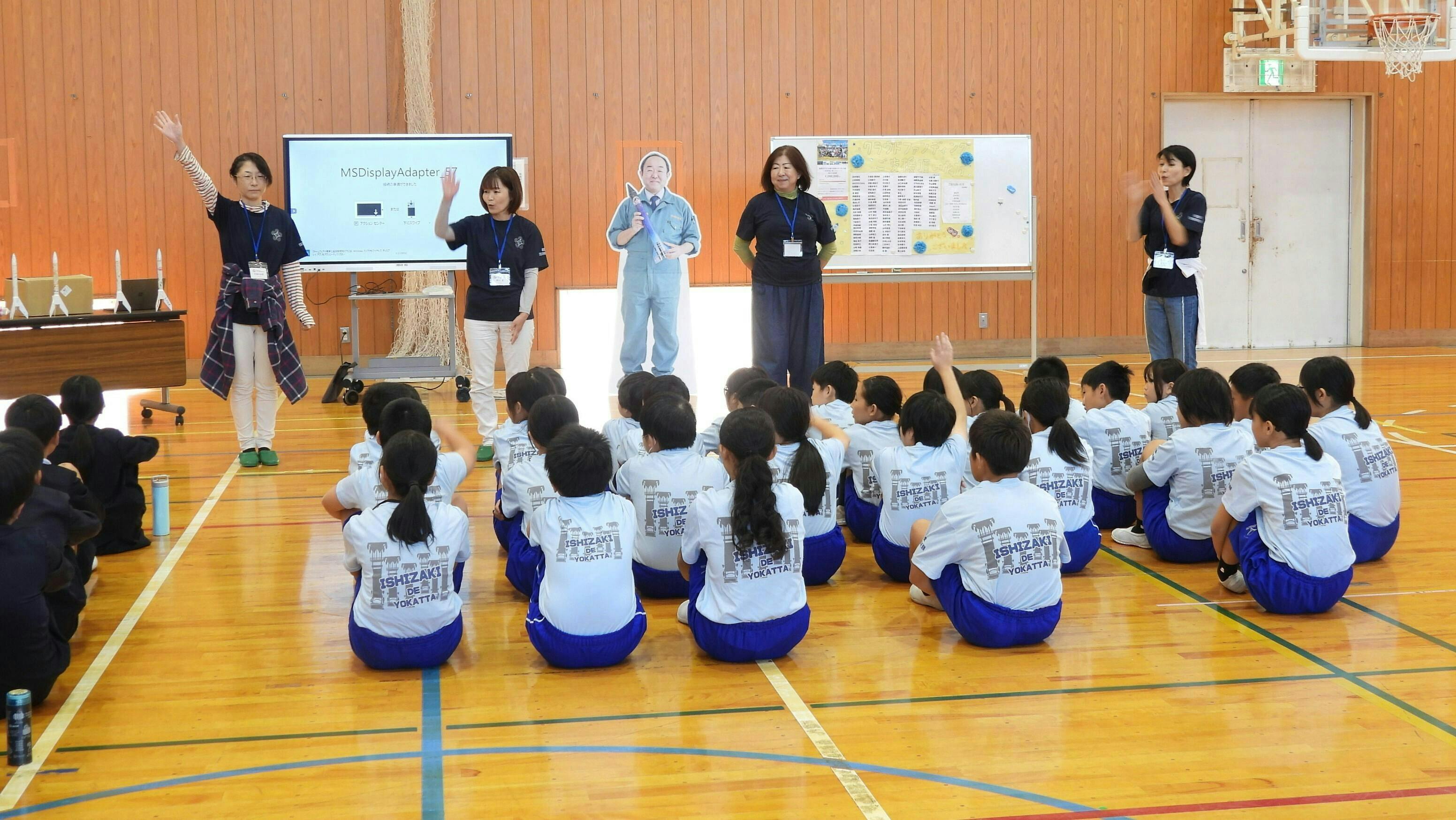 開催当日、もちろんめちゃくちゃ快晴!!石崎小学校体育館&グランドにて、石崎小学校4年生・能登島小学校6年生のロケット教室、無事に合同開催。