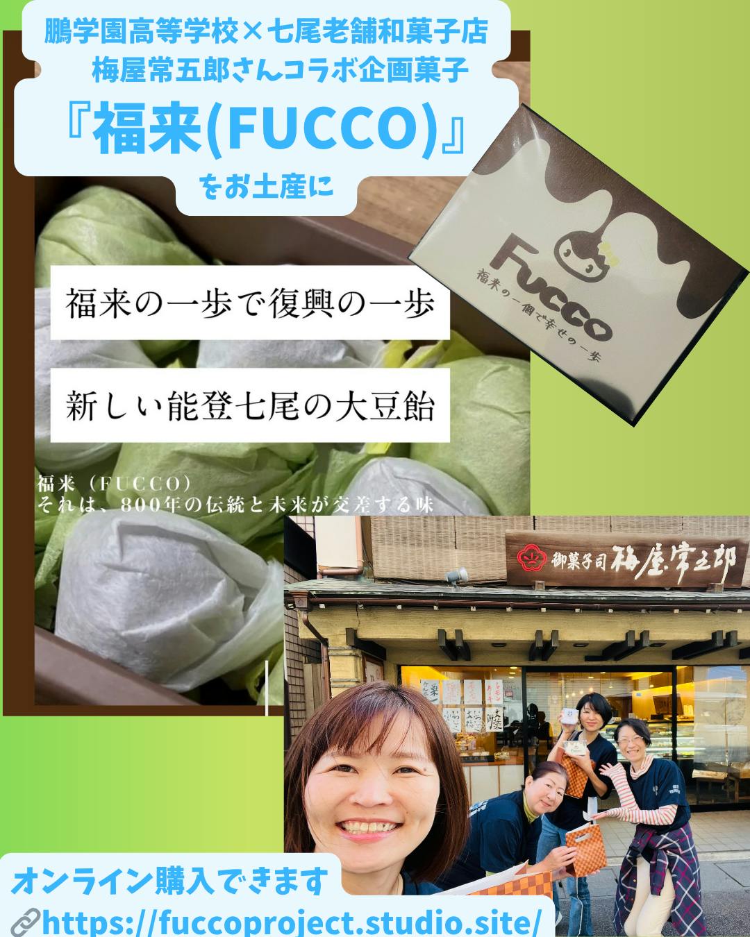 10/25に京都洛中ロータリークラブさん主催「Dream×Goal~高校生のための未来発見フェス~」能登半島地震「心の復興」支援が開催され、鵬学園高等学校さんがご招待されていました。私もボランティアスタッフとして参加させて頂き、「福来(FUCCO)」というお菓子を頂きました。「FUCCO」は、鵬学園高等学校×七尾老舗和菓子店 梅屋常五郎さん(中田英寿さん監修)のコラボ商品で、「大豆飴」の文化継承と震災復興の想いと手に取った人に「福が来る」という願いがこもったお菓子です。オンライン購入も可能とのこと。良かったらご賞味下さい。