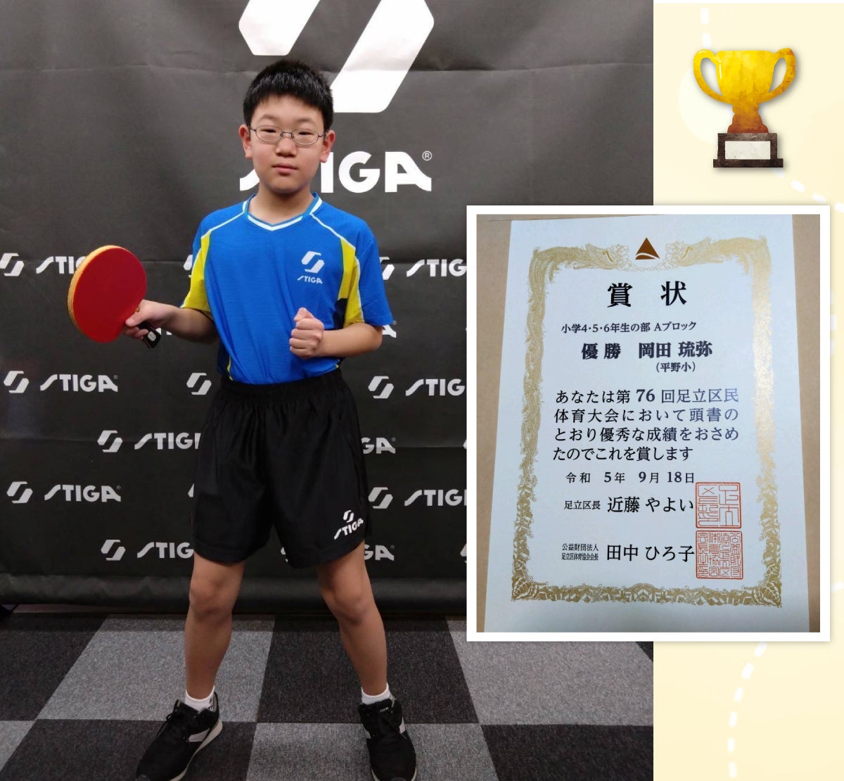 特に大好きな卓球においては、現状、自分よりもひとまわり大きな子と対戦する中でも屈することなく立ち向かい、足立区小学生大会において、3連覇を果たしました。