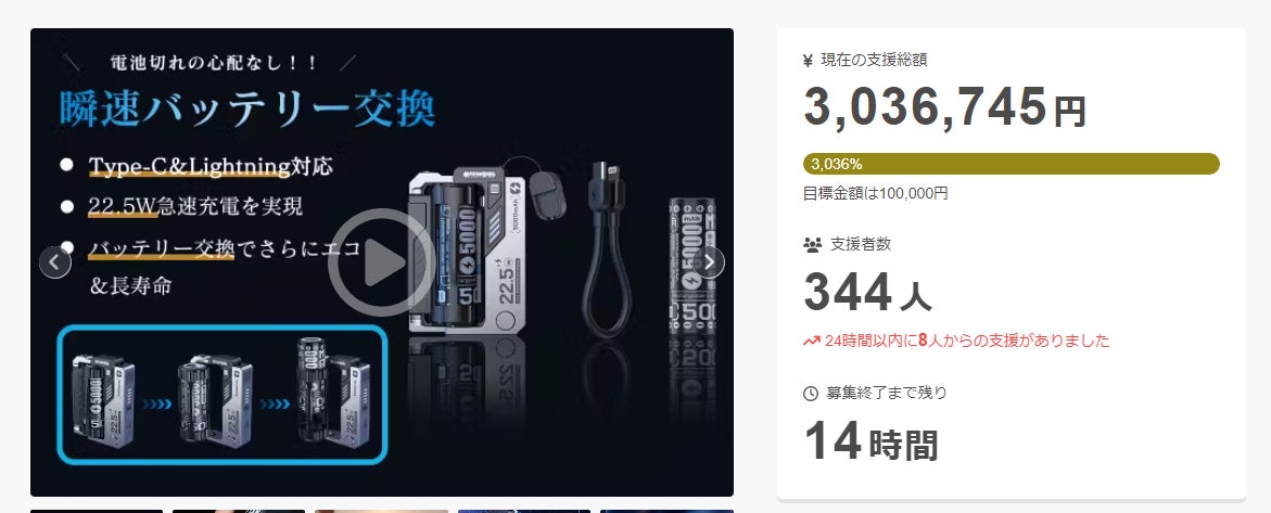 皆様のご支援に心より感謝申し上げます。「瞬速バッテリー交換&2WAY充電対応!パワフルな22.5W双方向充電器」プロジェクトへのたくさんのご支援、誠にありがとうございます。プロジェクト終了まで残り14時間となりました。皆さまがたくさんのSNSへのシェア、知り合いの方へのお声がけをしていただけたからこそ、この結果をいただくことが出来たと思います。最後まで気を抜かずに頑張っていきますのでご応援及び拡散を宜しくお願い致します。