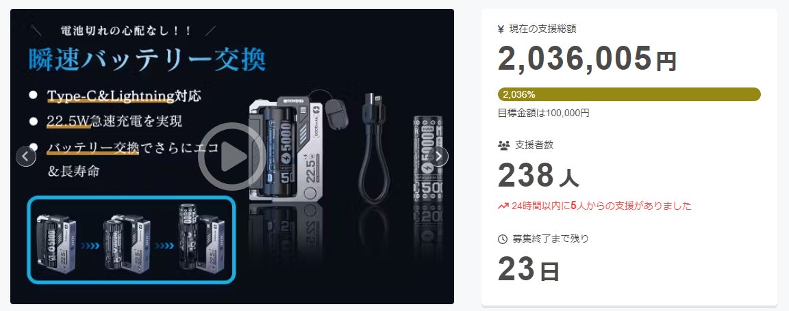 「瞬速バッテリー交換&2WAY充電対応!パワフルな22.5W双方向充電器」プロジェクトへのたくさんのご支援、誠にありがとうございます。