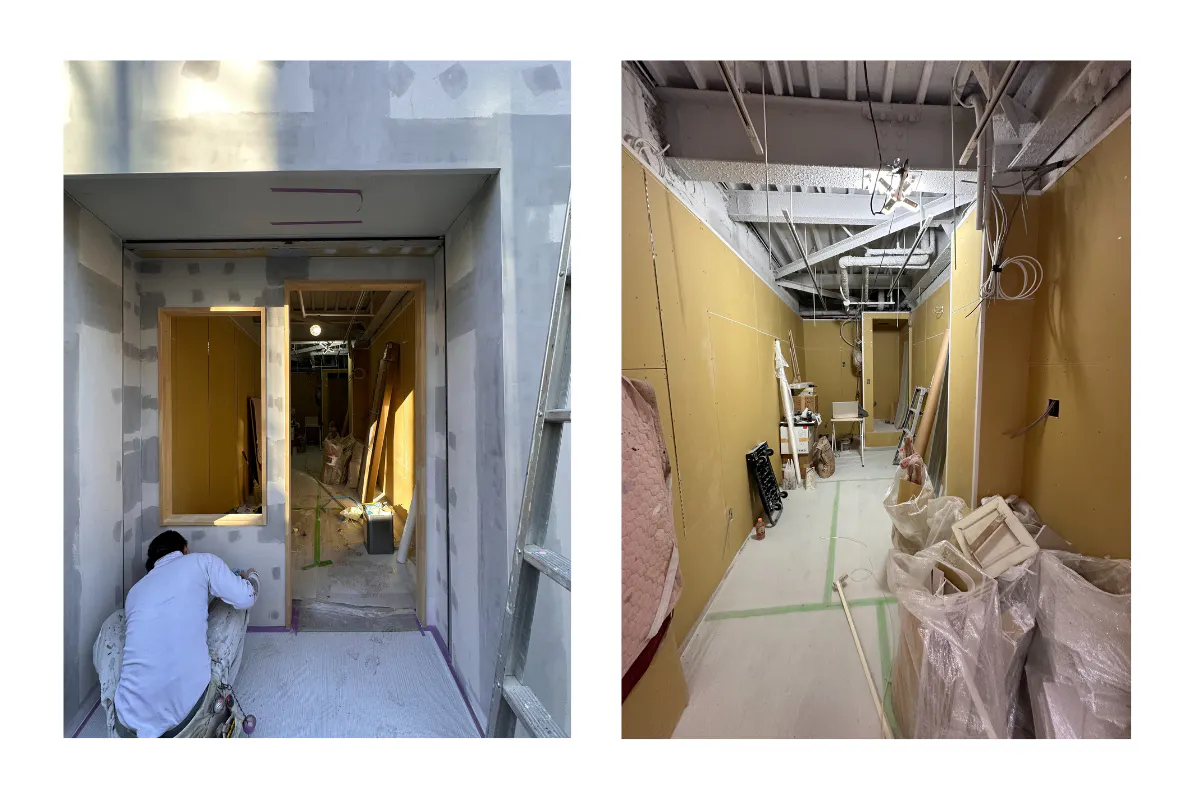 天井はオフホワイトの塗装。床はモルタル塗り。壁が出来て、形がだんたんと出来てきてます。