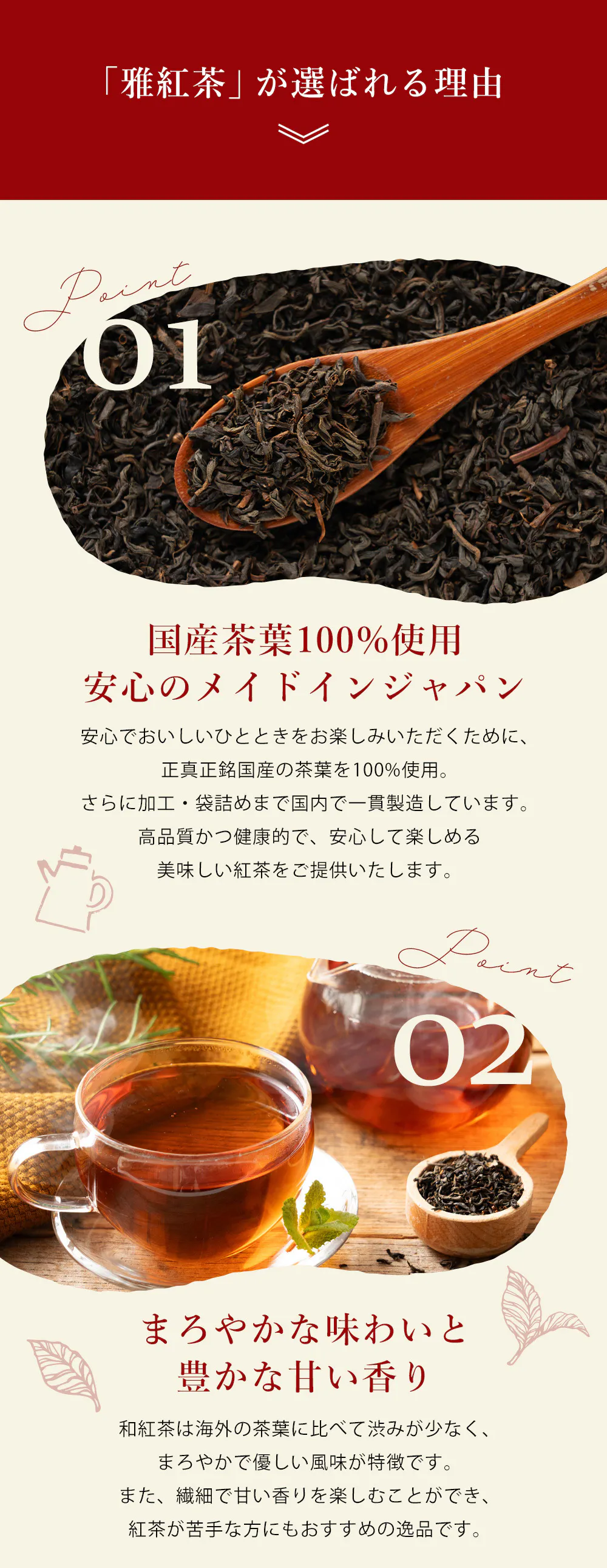「雅紅茶」は、日本全国の和紅茶を専門に扱うECサイトです。私たちが目指すのは、「雅紅茶に来れば、日本全国の選りすぐりの和紅茶が必ず手に入る」という、和紅茶好きにとってのECショップを創ること。