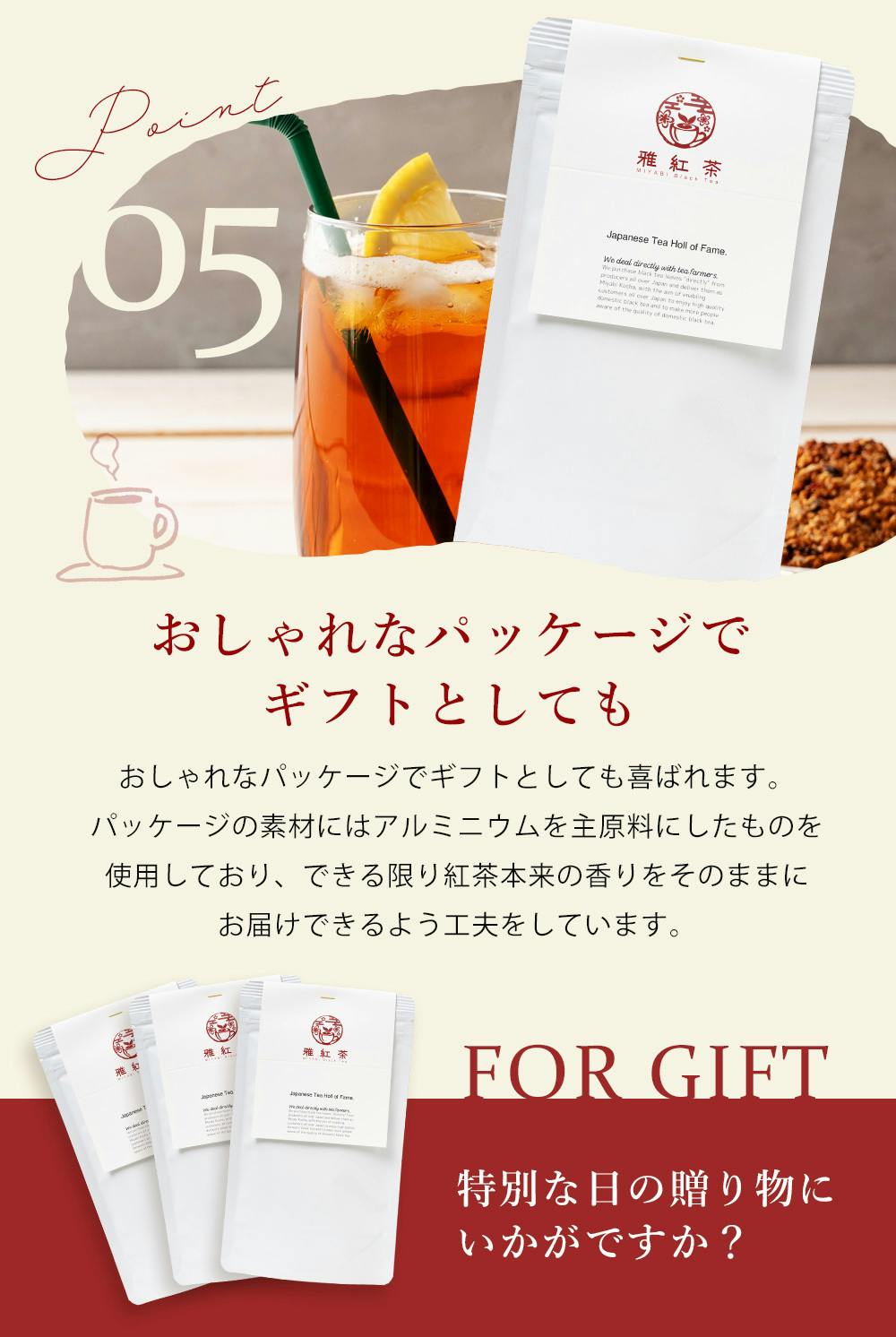私たちの紅茶は、味わいだけでなく、その美しいパッケージデザインにもこだわっています。贈り物としても、自分自身へのご褒美としても、雅紅茶は皆様の日常に彩りを添えること間違いありません。