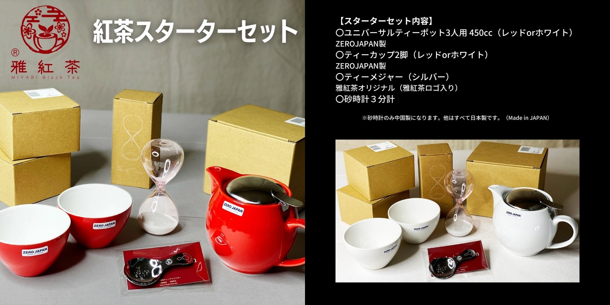 雅紅茶 スターターセット:紅茶を始める方のために特別なスターターセットをご用意しました。ZEROJAPANの美しいデザインと使いやすさを兼ね備えたティーウエアをセットにしています。和紅茶を淹れるのに必要な器具と、おいしい紅茶を楽しむためのアイテムが含まれています。