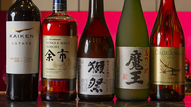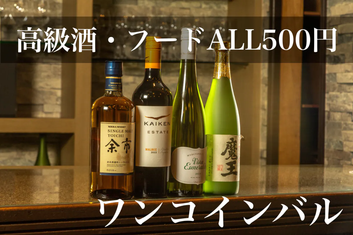 白ワイン・赤ワイン・魔王・余市・獺祭などの高級酒も全て500円でご提供します。