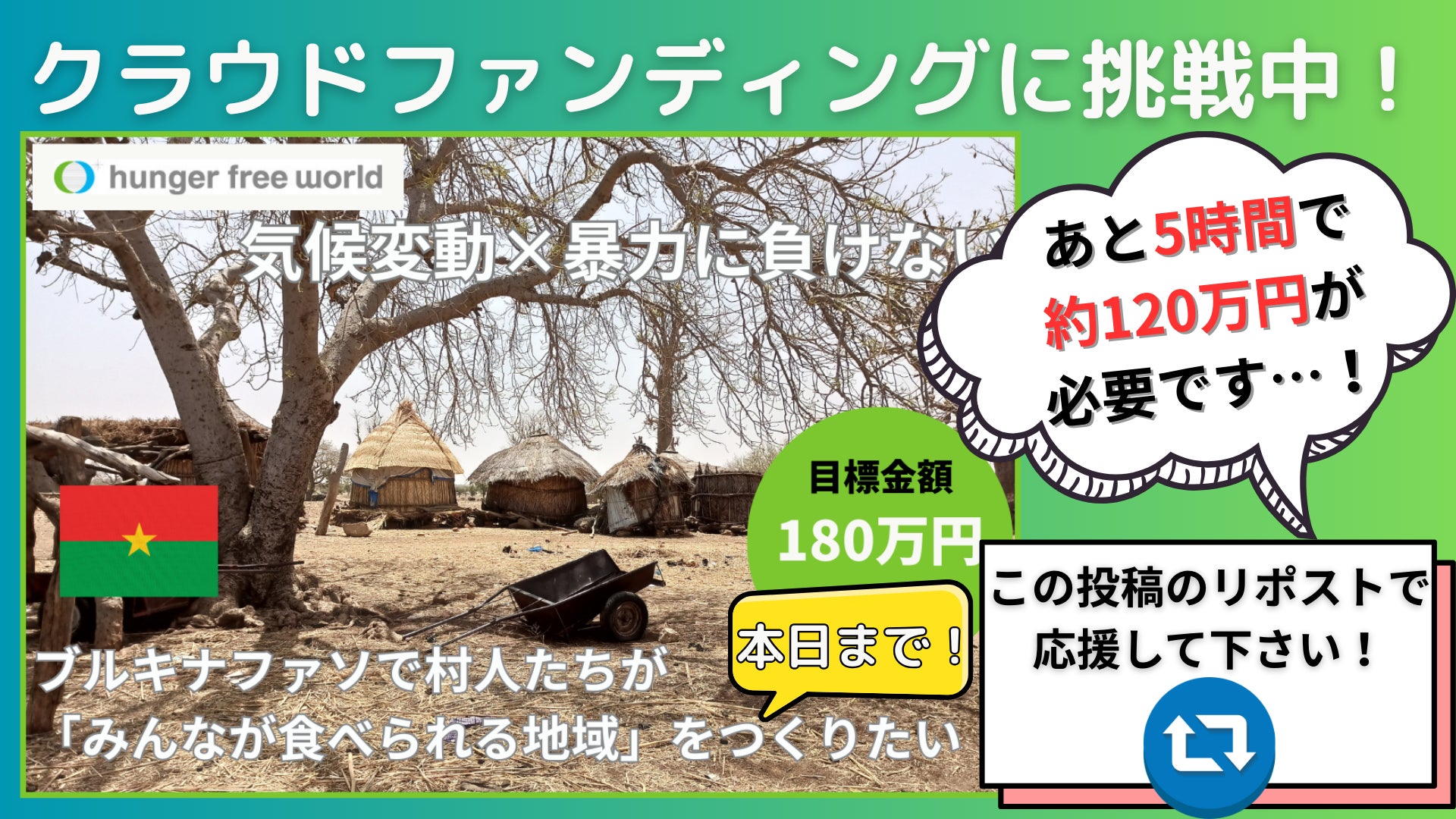 2025/04/30 14:42ハンガー・フリー・ワールドへのあたたかいご支援を誠にありがとうございます。 4月1日から挑戦してきたクラウドファンディング「気候変動×暴力危機のブルキナファソで村人たちが「みんなが食べられる地域」をつくる」が本日最終日となりました。 現在までに、44名の方から396,000円のご支援を頂いております。 ご支援、ご協力頂いたみなさま、誠にありがとうございます! ブルキナファソ支部事務局長フランソワからもお礼のメッセージビデオが届いておりますので、ぜひご覧ください。 ブルキナファソは世界で最も忘れられた危機として、2年連続で1位を獲得しており、日本でもほとんど現在の危機的状況は報道されません。そうしたブルキナファソへ、みなさまが関心を寄せて頂き、ご支援いただいたことに心よりお礼申し上げます。 ですが、目標金額の180万円にはまだ140万4千円が足りません。 クラウドファンディング終了時刻である、本日23時まで、村人たちへの挑戦への支援をあきらめたくありません! 以下の活動に共感頂いた方は、何卒ご支援、ご協力をお願いいたします。 この投稿のシェアでも構いません。 最後の最後まで、どうぞよろしくお願いいたします。 ✼••┈┈┈┈┈┈┈┈┈┈┈┈┈┈┈┈••✼ 共感したら【この投稿のシェア】で応援してください! ひとりでも多くの人にブルキナファソでの活動を知ってもらうため、 あなたのいいねとシェアが力になります! ✼••┈┈┈┈┈┈┈┈┈┈┈┈┈┈┈┈••✼ まじめで勤勉で、高潔な人々という国名にも現われているブルキナファソの人びと。彼らは今、気候変動×暴力危機という二重の課題を抱えています。 気候変動による干ばつ、豪雨災害により、土壌の劣化が激化。農業生産量が減少しています。 近年では国境付近を中心に、武装集団によるテロや誘拐事件などの暴力が頻発。結果、4万2000人が壊滅的な食料不安に陥り、200万人以上が避難民となっています。 そうした中で、私たちの活動地ワルドゴ村、ヴォセ村の村人たちが、みんなが食べられる地域づくりのために立ち上がりました。 5ヵ年計画を立案し、実行するのもすべて村の人びと自身。彼らの挑戦が成功すれば、気候変動×暴力の問題に苦しむ多くの人びとの希望になります。 ブルキナファソに灯った希望の灯を絶やしたくない! 皆さんのご支援を何卒よろしくお願いいたします。 クラウドファンディング「気候変動×暴力危機のブルキナファソで村人たちが『みんなが食べられる地域』をつくる」 【公開期間】4月30日(水)23時まで あと8時間! 【目標金額】180万円 ★現在22% 396,000円 あと140万4千円! 【ご支援はこちらから】 https://camp-fire.jp/projects/829546/view#自立支援 #クラウドファンディング #募金 #main #アフリカ #飢餓をゼロに #ブルキナファソ #国際協力 #NGO #気候変動を止めよう #飢餓 #食料問題 もっと見る