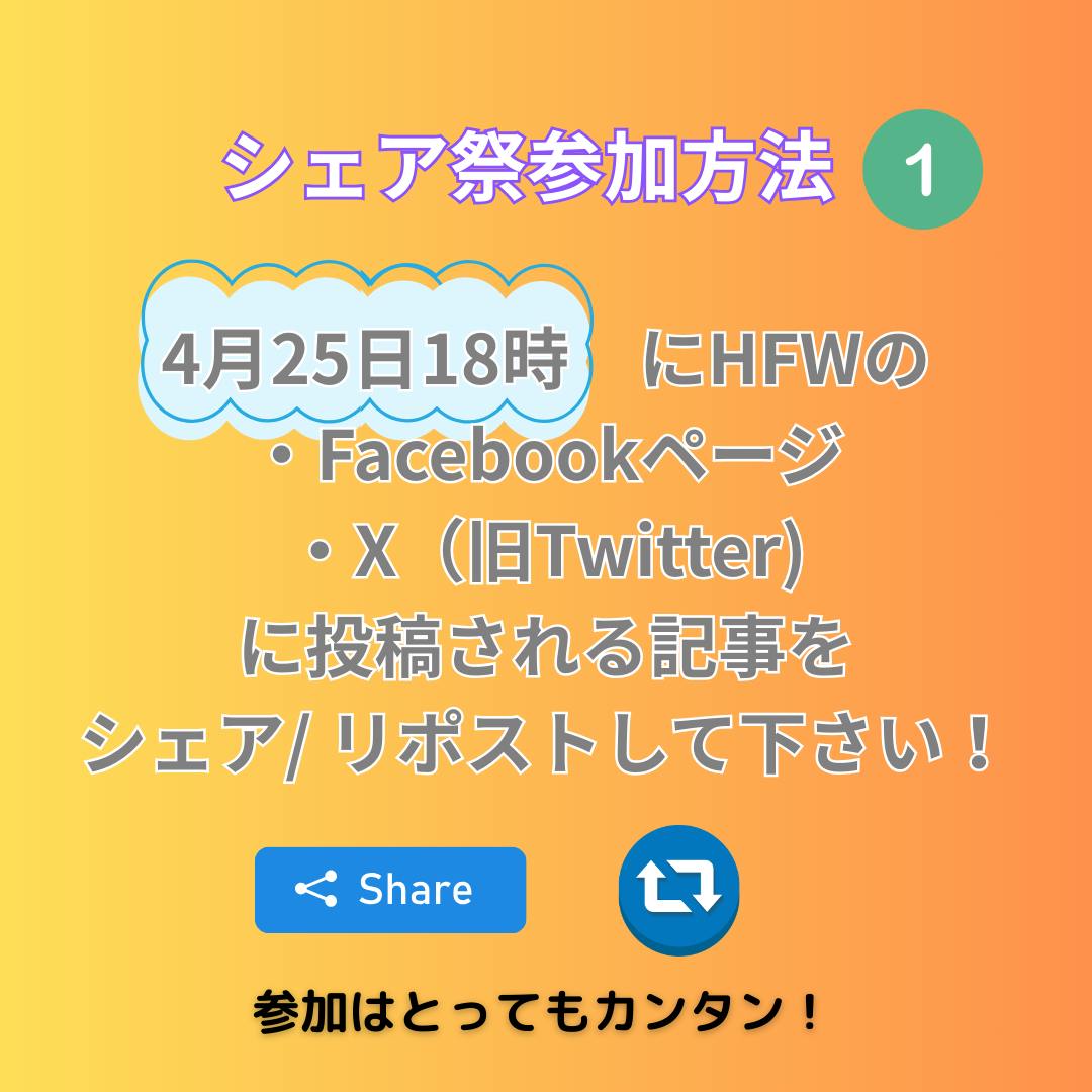 ①4月25日(金)18時にハンガー・フリー・ワールドのFacebookページ、Xに投稿される記事をシェア、リポストしてください!