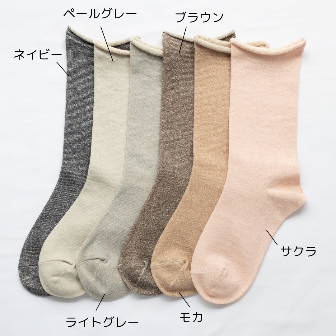 ペルーで手摘みされた、高品質の2種類のコットンをブレンドし、素肌に触れる内側部分に贅沢に使いました。 履き口にゴムを入れていない、しめつけず、リラックスして履ける靴下です。