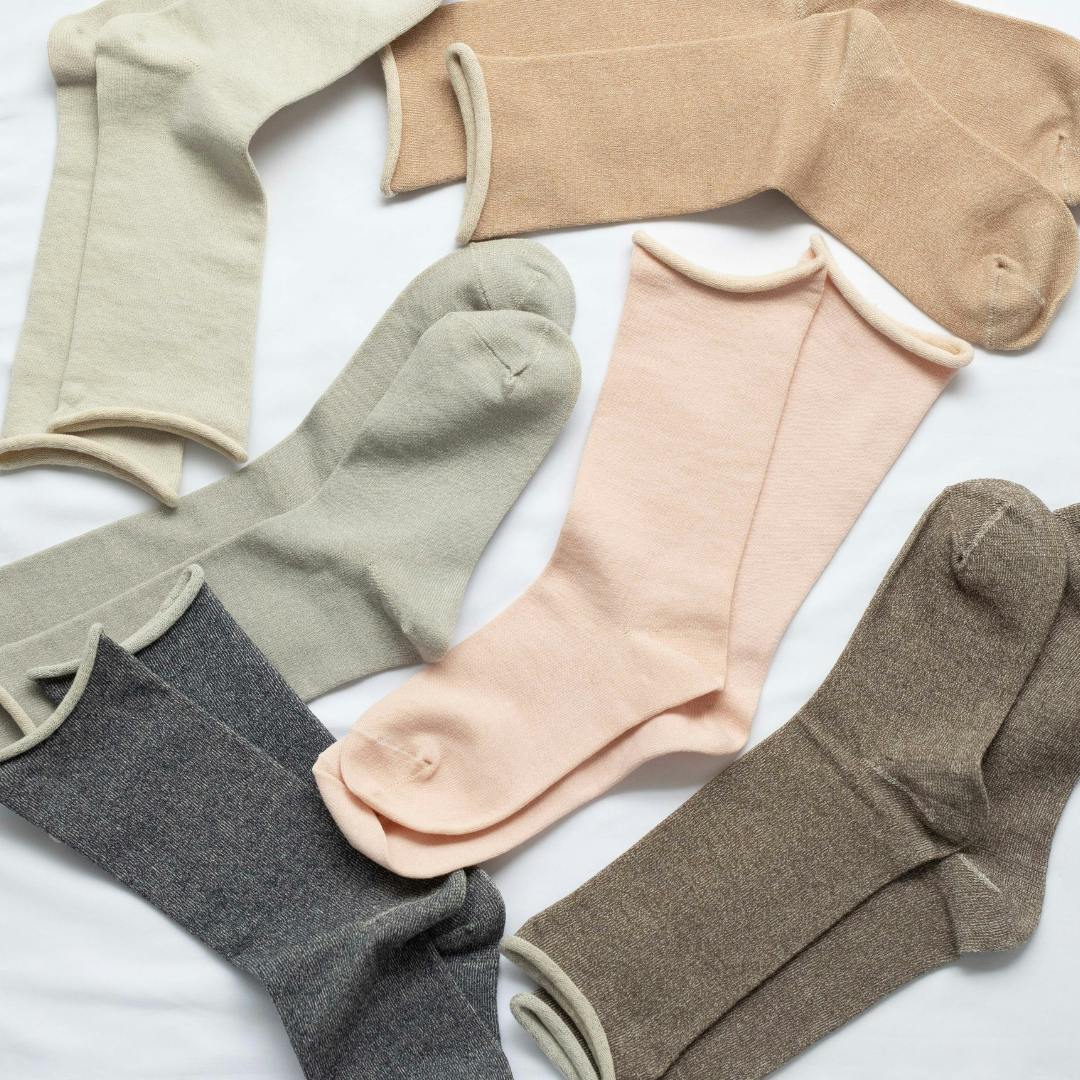 ペルーで手摘みされた、高品質の2種類のコットンをブレンドし、素肌に触れる内側部分に贅沢に使いました。 履き口にゴムを入れていない、しめつけず、リラックスして履ける靴下です。