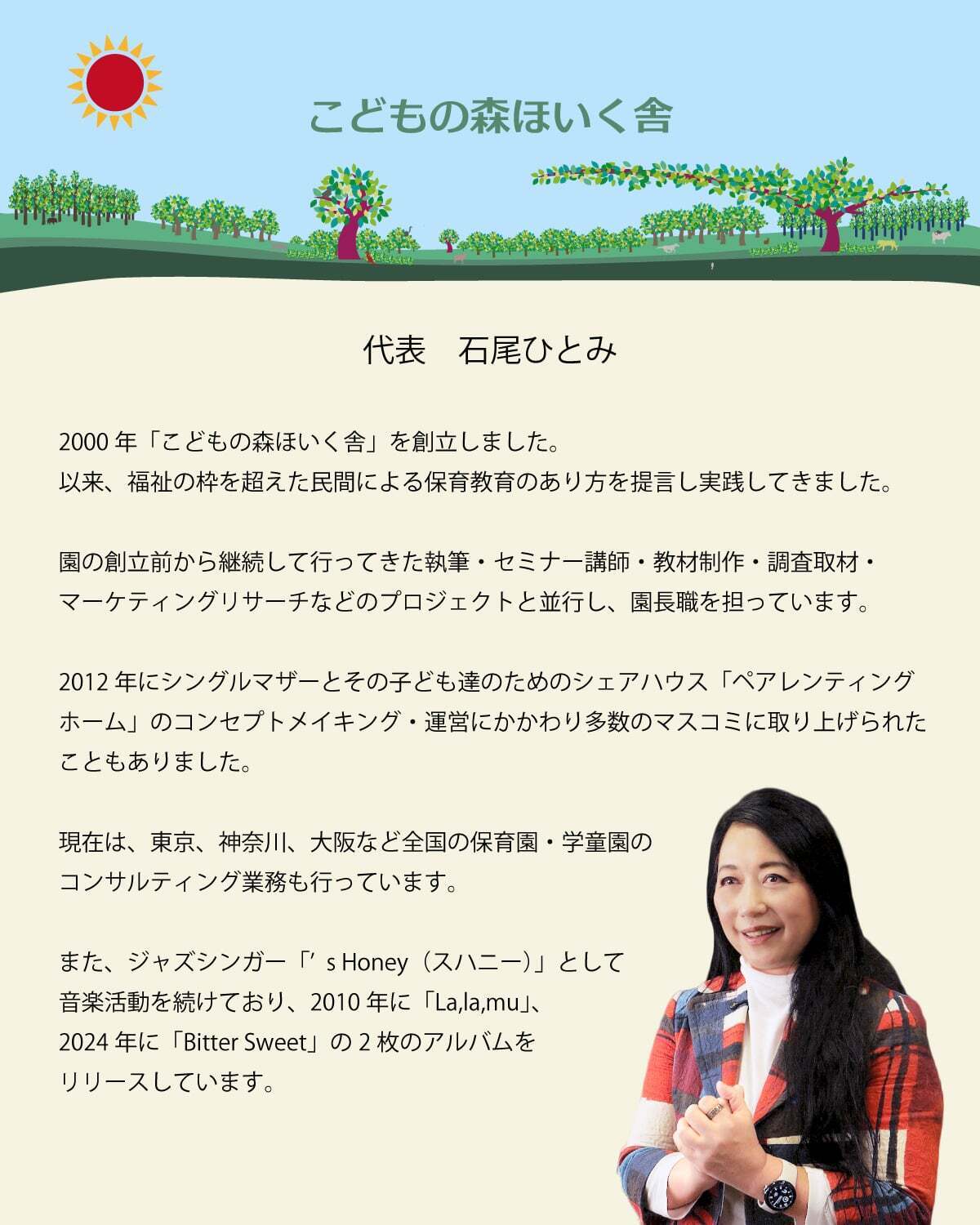 「こどもの森ほいく舎」代表の石尾ひとみと申します。