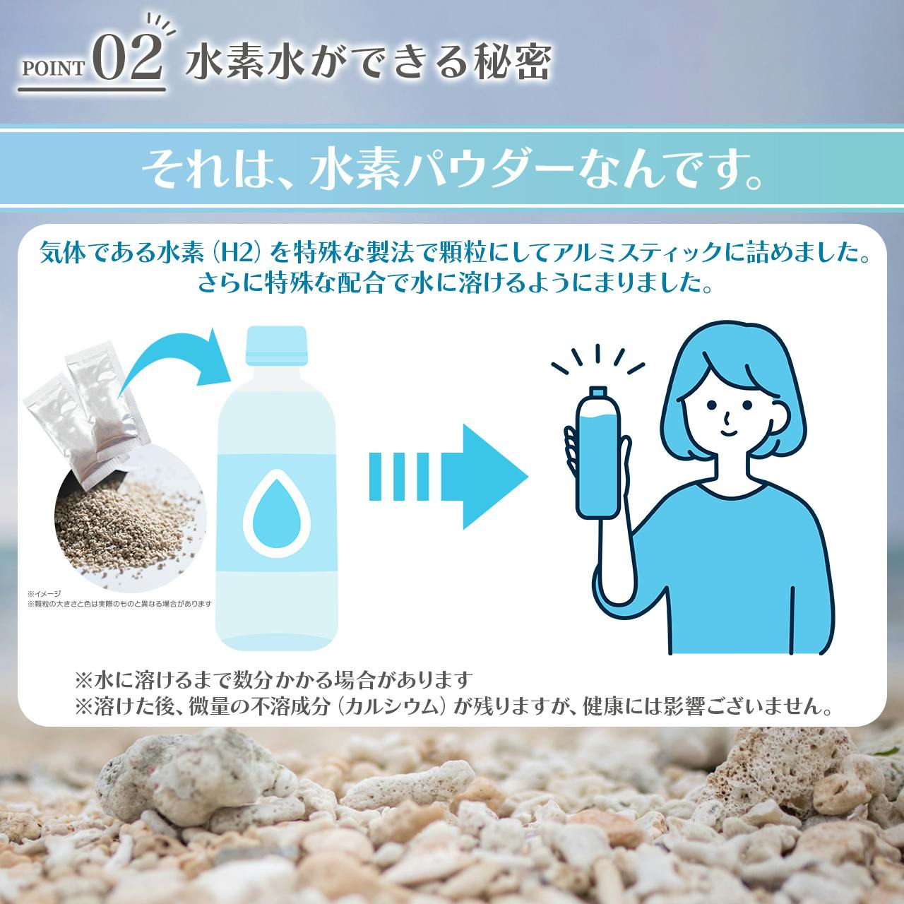 ✔ 手軽さ:専用機器不要で、水に溶かすだけで水素水を生成