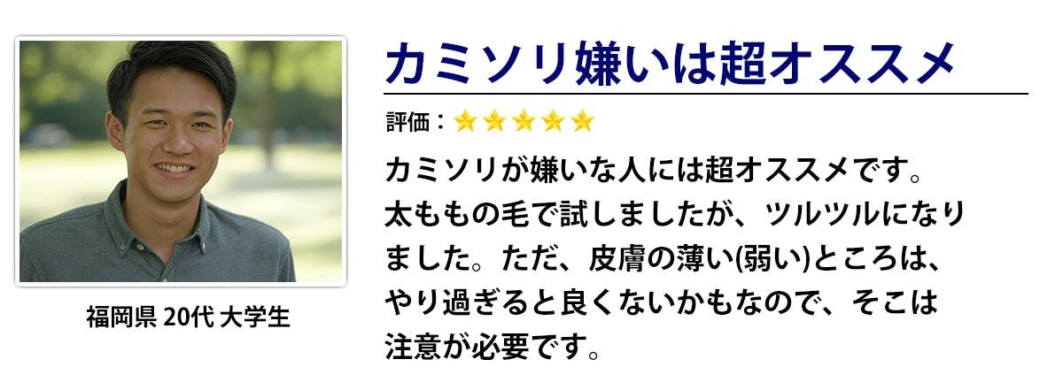 A:個人差はありますが、私の場合、週2回のお手入れで快適をキープできています。毎日のカミソリ処理から解放されます。