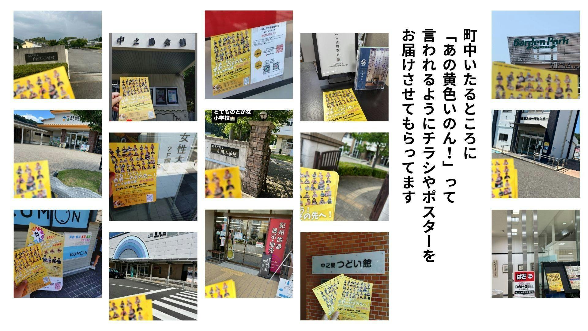 「あの黄色いチラシ、最近よく見るね!」そんな声が届くように──地元のスーパー、公民館、小学校、駅、地域施設…仲間と手分けして、町じゅうにチラシとポスターを届けています!中には、車で40分かけて学校の校門で手渡ししたり、店頭で直接お願いして掲示していただいたり…一軒一軒、丁寧にお願いしてまわっています。「届けたい想いがあるから、動ける」ギネス挑戦まで、まっすぐ進んでいます!引き続き、応援よろしくお願いいたします