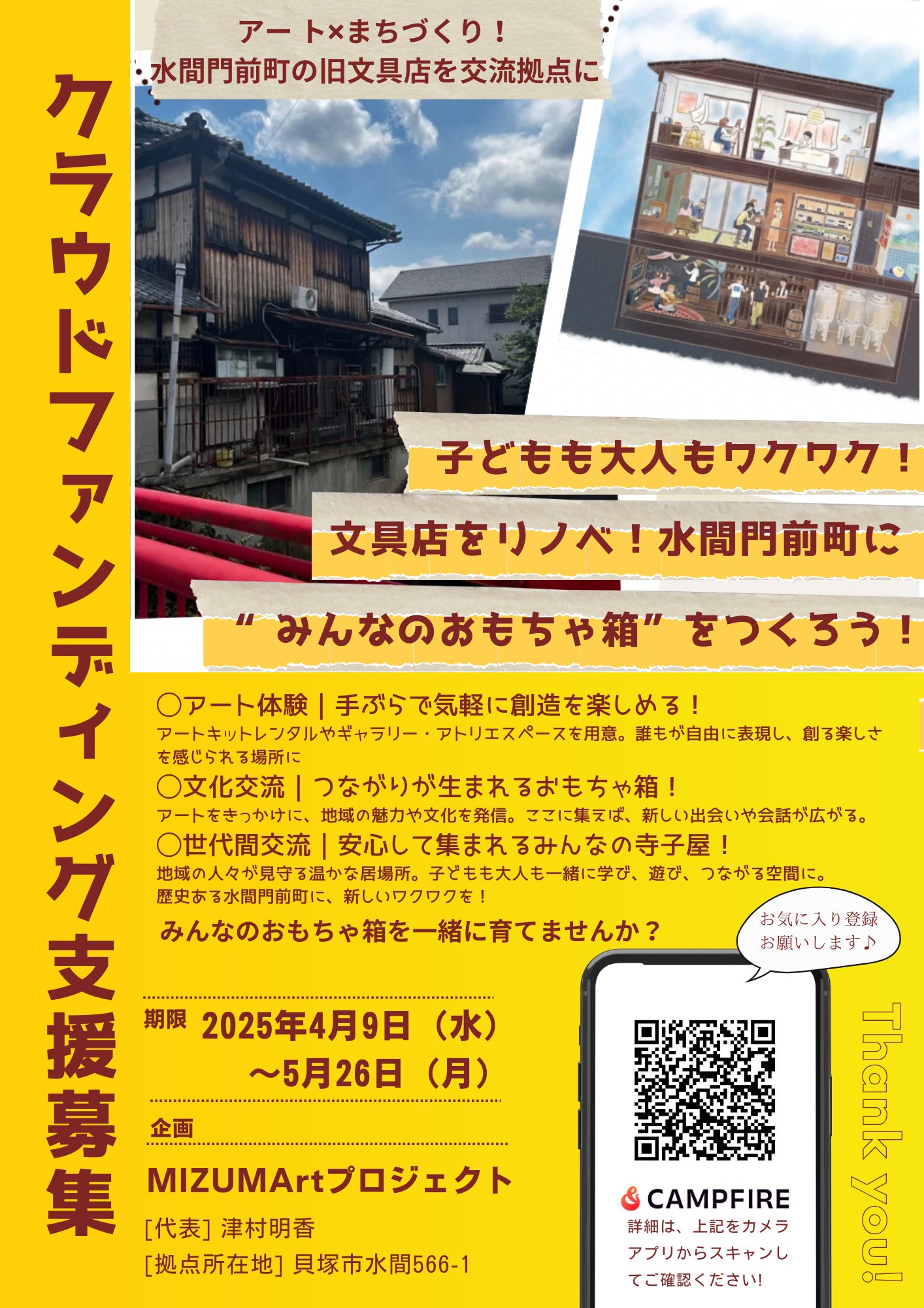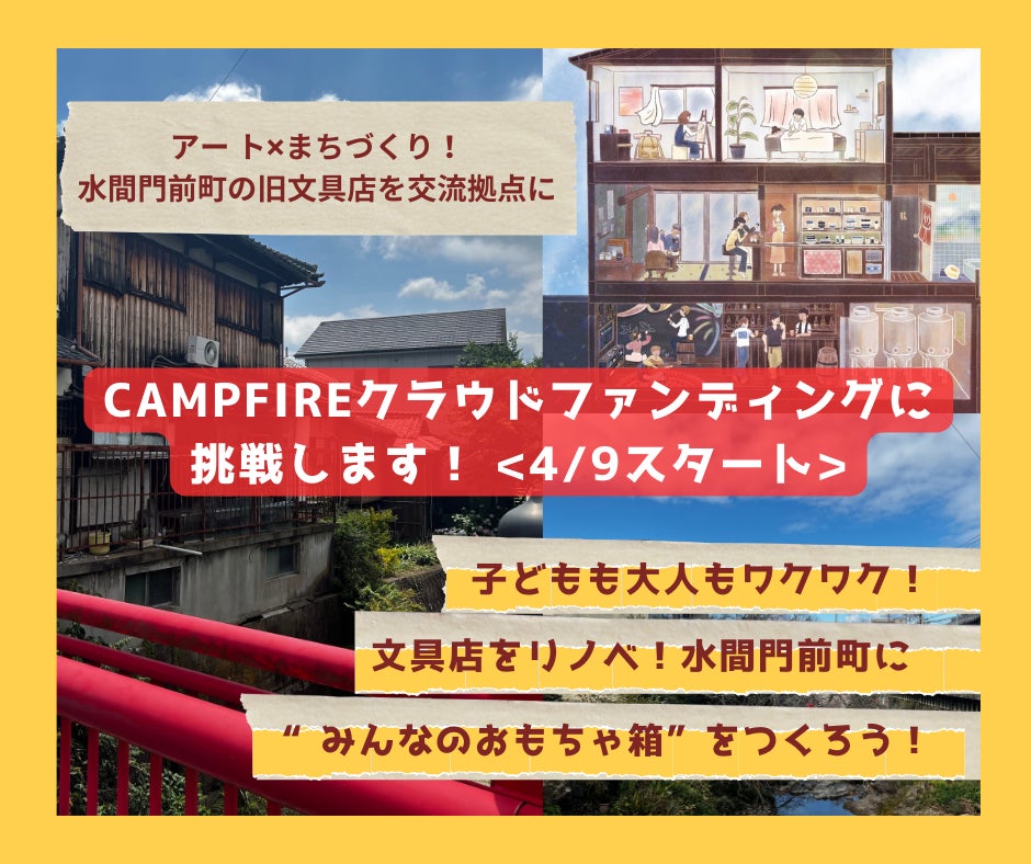 水間門前町に、“おもちゃ箱”のような拠点をつくるこのプロジェクト。ふらっと立ち寄れて、アートを楽しんだり、地域の人とつながったり、子どもから大人まで、誰もがちょっと元気になれる場所を目指しています。