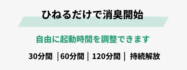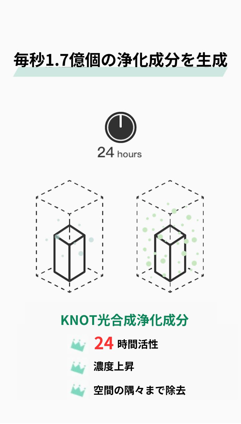 ランプの体積によりKNOTは1~3坪の空間での使用に適しています。車内、靴箱、クローゼット、リュックサックなどの密封空間での使用もおすすめです。エアコンや扇風機と併せて:室内や車内の空間でのご使用時、エアコンや扇風機などで空気を循環させながらの使用が最適です。