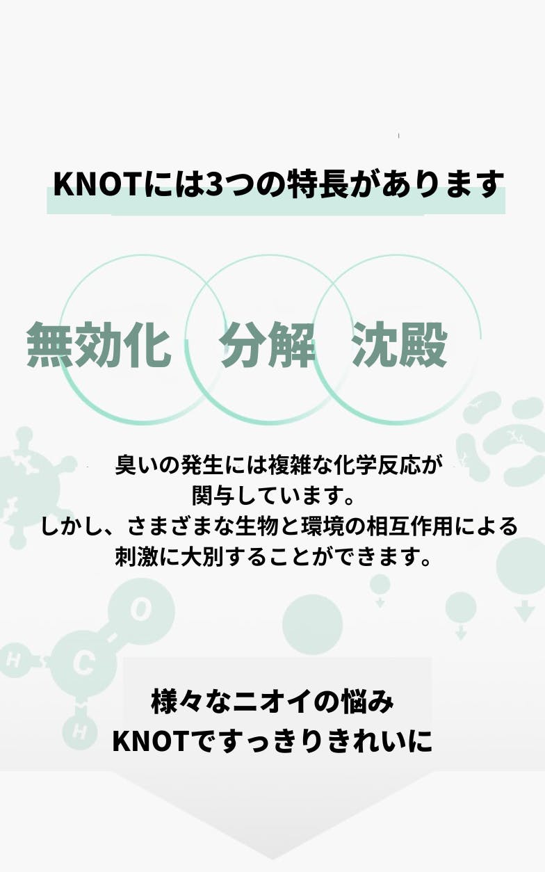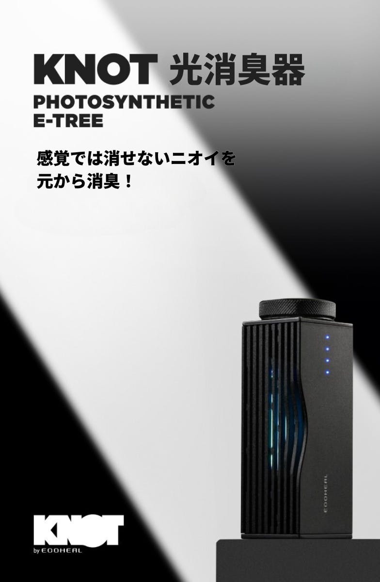 製品のご購入時からご購入頂いた後まで、常に+αの付加価値提供を追求しています。今回紹介させていただく「KNOT光消臭器」はお家の中から車内まで置くだけ簡単な消臭グッズです。香りで誤魔化すのではなく、ニオイを分子レベルで分解することでより確かな効果を追求しました。ニオイのこもりがちなこれからの季節、ぜひこの製品をお試しいただければ幸いです。
