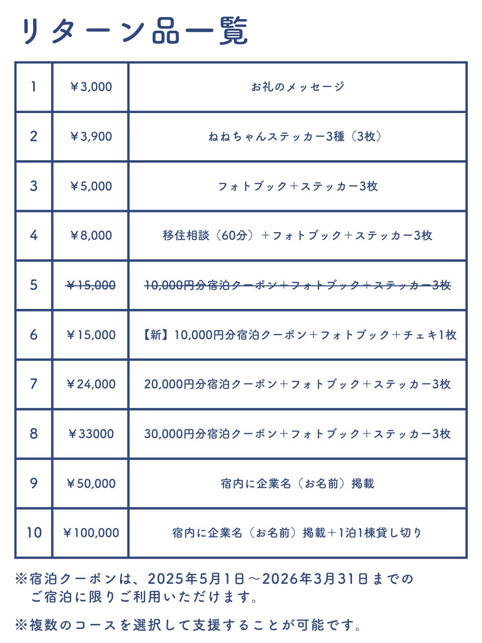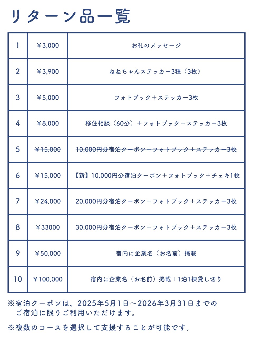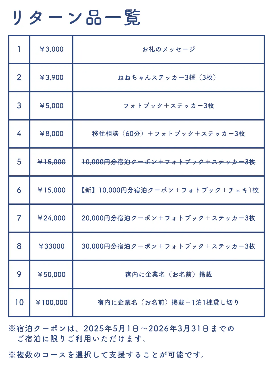 リターン品の一覧表を作りました。