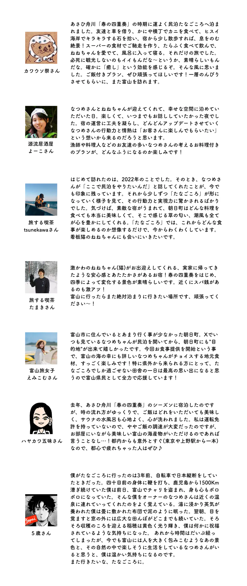 2025/04/06 21:21この度は、クラウドファンディングにご支援くださった皆様、誠にありがとうございました。皆様のご支援のおかげで、食事提供の準備を進めることができ、4月2日より朝食の提供を開始しました。さっそくお客様にもご好評いただいており、本当に嬉しい気持ちでいっぱいです。ありがとうございます!宿を始めて以来、「朝日町の美味しい海産物(特にカニ汁)をお客様に味わってもらいたい」という想いがずっとありました。 その願いがついに実現できることを、とてもうれしく思っています。 改めて、心より感謝申し上げます。リターン品の発送時期についてプロジェクトページにも記載しておりますが、食品のリターン品については具体的な発送日程を明記していなかったため、改めてご案内いたします。4月下旬発送予定・3,900円【ステッカー応援プラン】・5,000円【フォトブック応援プラン】・8,000円【移住相談プラン】フォトブックとステッカーを4月下旬に発送いたします。4月20日(日)までに、日程調整のメールをお送りしますので、ご確認をお願いいたします。・15,000円 / 24,000円 / 33,000円【宿泊応援プラン】フォトブック、ステッカー、チェキを4月下旬に発送いたします。4月20日(日)までに、予約時に割引が適用されるキャンペーンリンクをメールにてお送りします。5月上旬発送予定(クロネコヤマト クール便)・6,300円【ホタルイカで応援プラン】・6,600円【干物で応援プラン】発送前に、ご希望の受け取り日時をメールで確認の上、お送りします。4月20日(日)までに個別にご連絡予定・3,000円【お気持ち応援プラン】メールを送付済みですが、一部の方には画像の容量の関係でメールをお届けできておりません。4月20日(日)までに再送いたしますので、今しばらくお待ちください。・100,000円【全力応援プラン】4月20日(日)までに、個別にメールをお送りします。支援者の皆様へ、改めて感謝申し上げます。 リターン品のお届けまで、もうしばらくお待ちくださいませ。 どうぞよろしくお願いいたします。民泊たなごころ 坪谷(なつめ) もっと見る