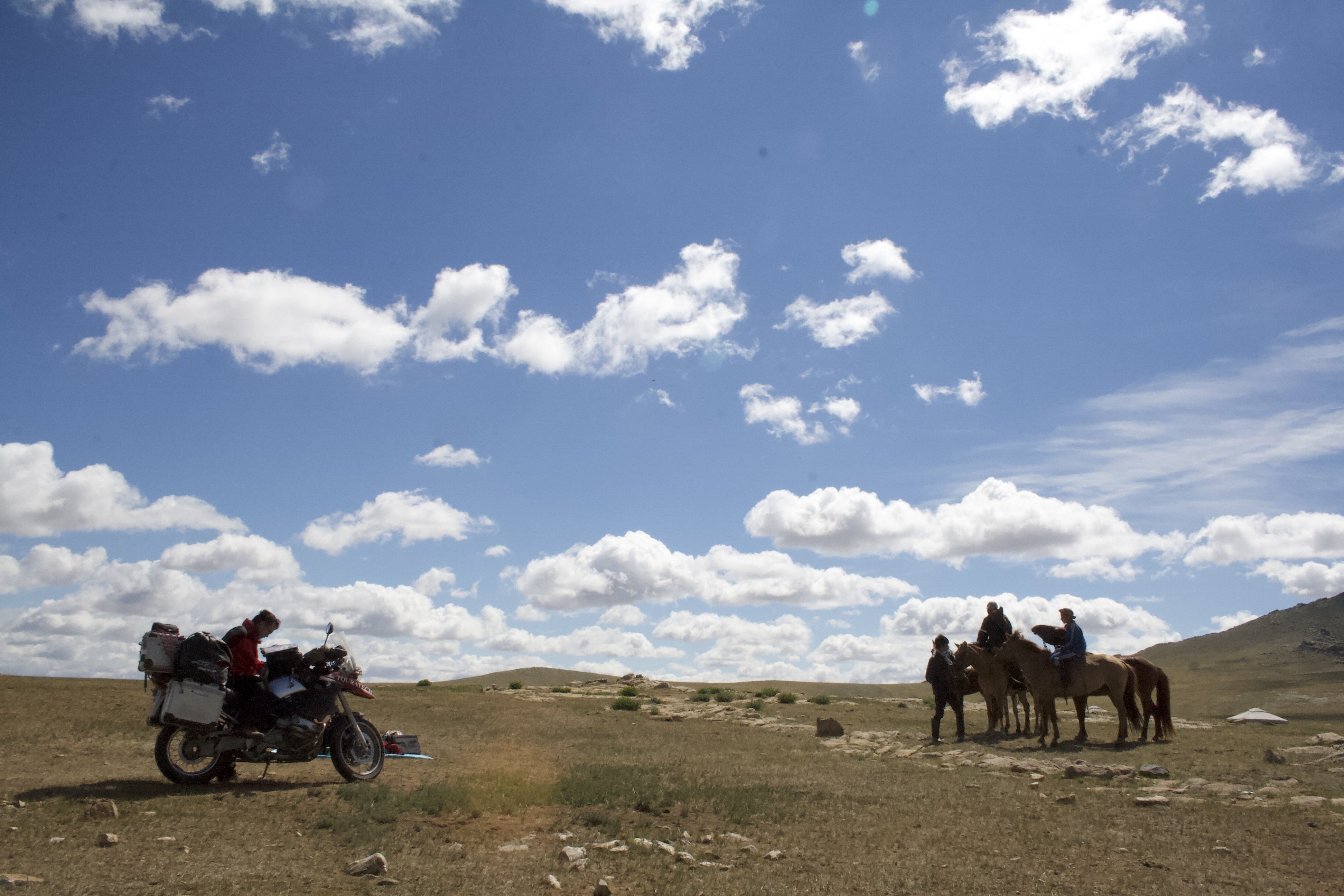 茨城の山の中で育つ。物心つく頃から、じーちゃんのカブの荷台に乗ってよく畑仕事について行っていた。そこからの流れる景色が初めての冒険の記憶。バイクで遠出した先の田んぼで、じーちゃんが帰らぬ人に。炎天下の山の中、3歳ナメ少年はこのままでは死ぬと思い家路をたどる。何度も振り返りみた、入道雲とバイクの風景が今でも鮮明に思い出せる。幼少期は山の中を走りまわって過ごした。田舎で映画館がなかったので、悪ガキどもと図書館のビデオブースにかじり付いて爆音で「スタンドバイミー」を観て、これがしたいと思う。東京に出て映画をつくる仕事を始める。仕事の合間でテントを積んでバイク旅〜 そんな時、アユミと出会い、インドア派の彼女をムリくりバイク旅に連れ出していく。アユミの夢に乗っかりバイクで世界を周る二人の旅を探すことに。